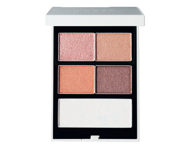 ①1の右上と中左を混ぜてアイホール全体にのせる。上まぶたのキワは2でインラインを入れて目元を締める。
