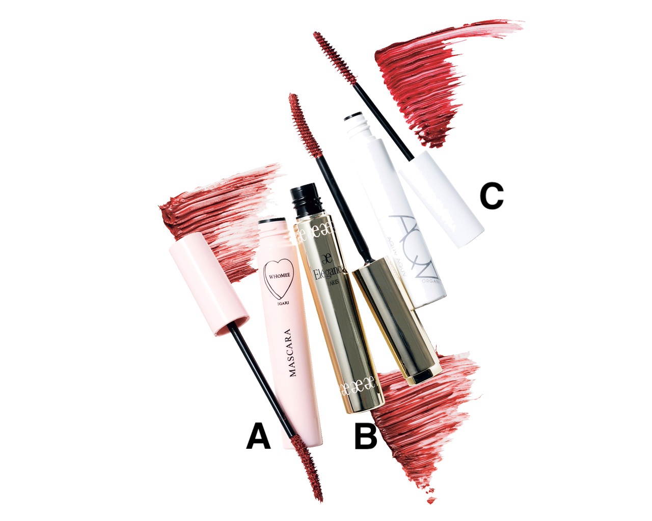 ②Aを、上まつげ中央から目尻にかけて根元を除き、毛先のみ赤を入れる。すべてに赤を塗ると頑張りすぎている印象になるので、このバランスがポイント。下まつげは全体にたっぷりと。