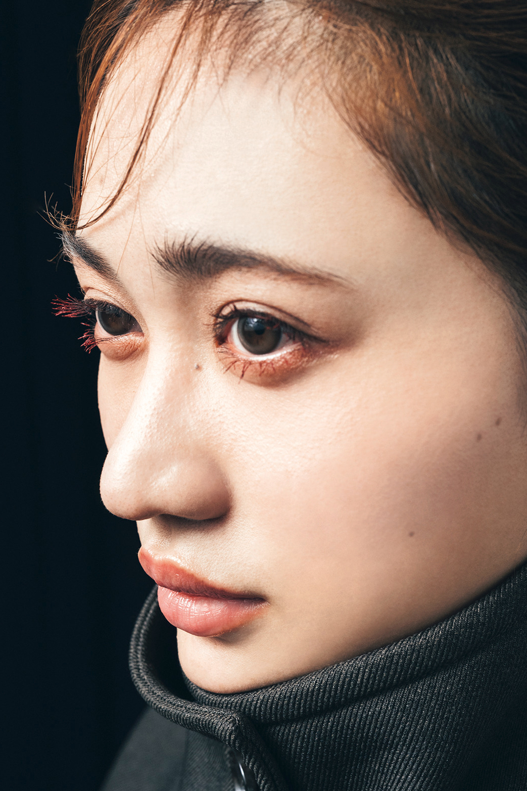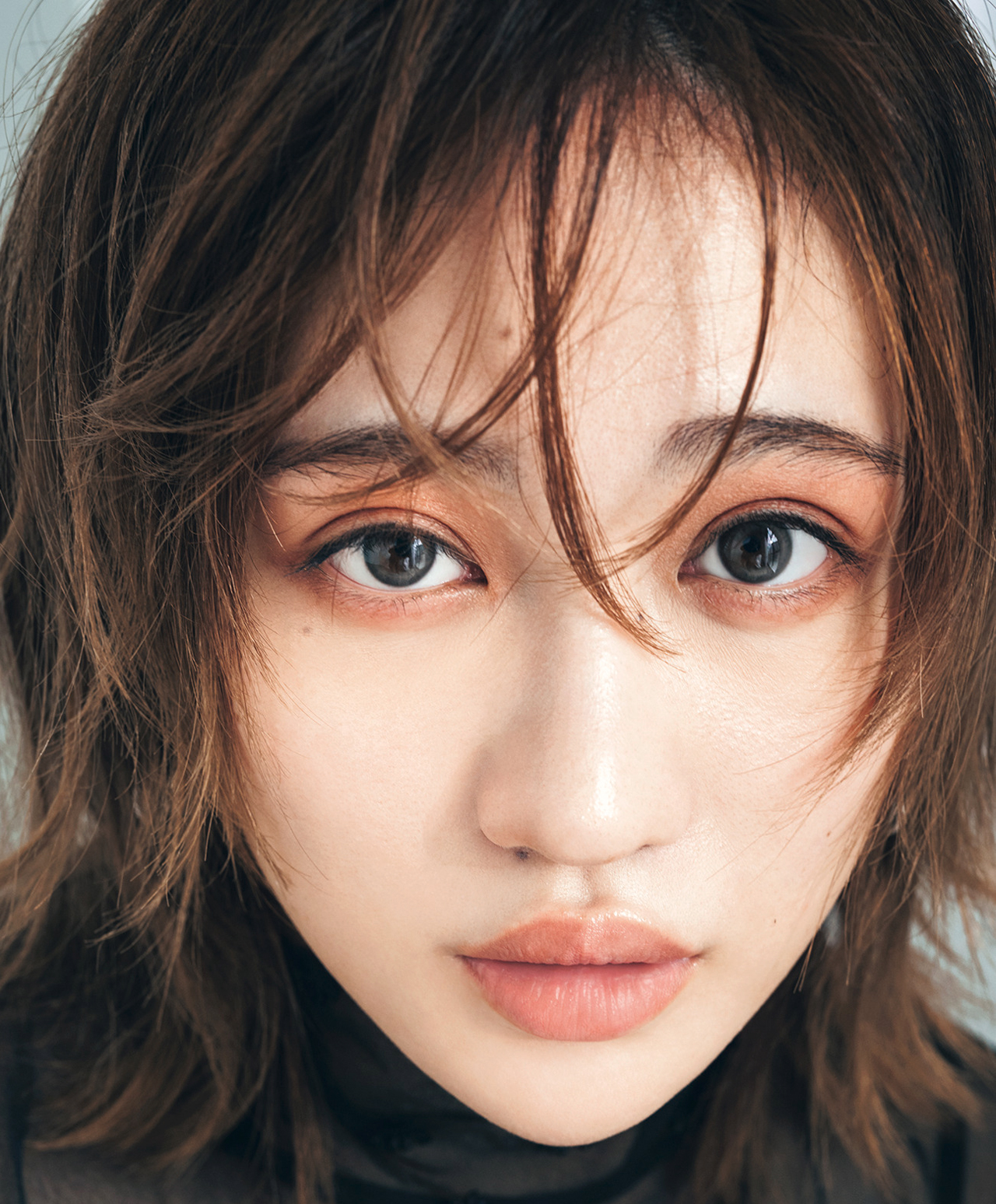 ちょこんと上まつげの毛先と下まつげに赤をのせた目元がもたらすのは、決して奇抜な印象ではなく、ふとした瞬間にドキッとさせるような余熱。光に透けたり、まばたきをしたときにさりげなく姿を見せる赤マスカラで、吸い込まれるような引力のあるまなざしに。