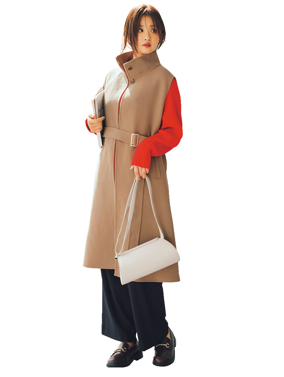 赤ニットを1点投入してジレから覗かせるだけで、きれいめコーデが見違えるほど華やかに。まろやかなサンドベージュと合わせるだけで、手軽に鮮度UPが叶います。