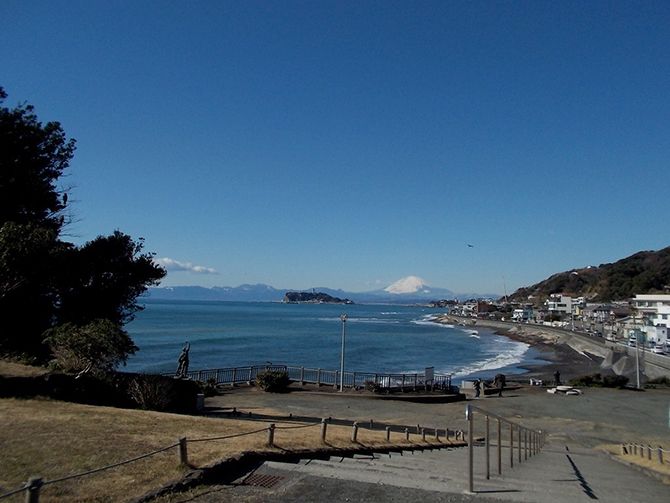 鎌倉市の海岸沿いに位置する「稲村ガ崎」は、富士山と江の島を相模湾越しに望む絶景スポットです。晴天時には伊豆大島や伊豆の山々までゆったり見渡すことも可能!