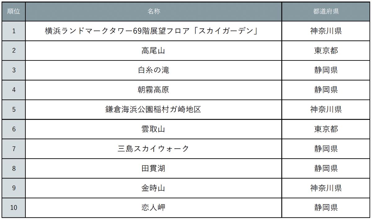 ランキングTOP10はこちら。今回は、山梨県・静岡県をはじめ、関東エリアからもその姿を望むことができる絶景スポットをチョイスしました。寒さを忘れるほどの絶景に出会えるこの季節。お気に入りの景色を探してみてくださいね!