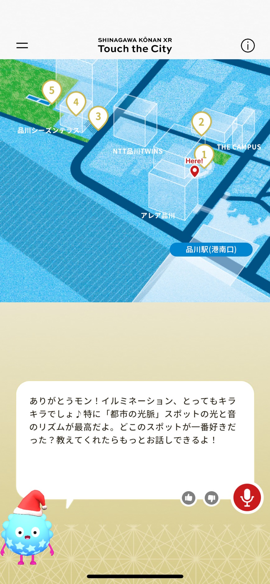 「イルミネーションめっちゃキレイ! ミナモンのおすすめスポットはどこ?」と話しかけると…