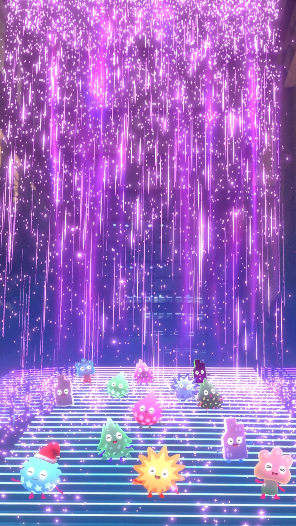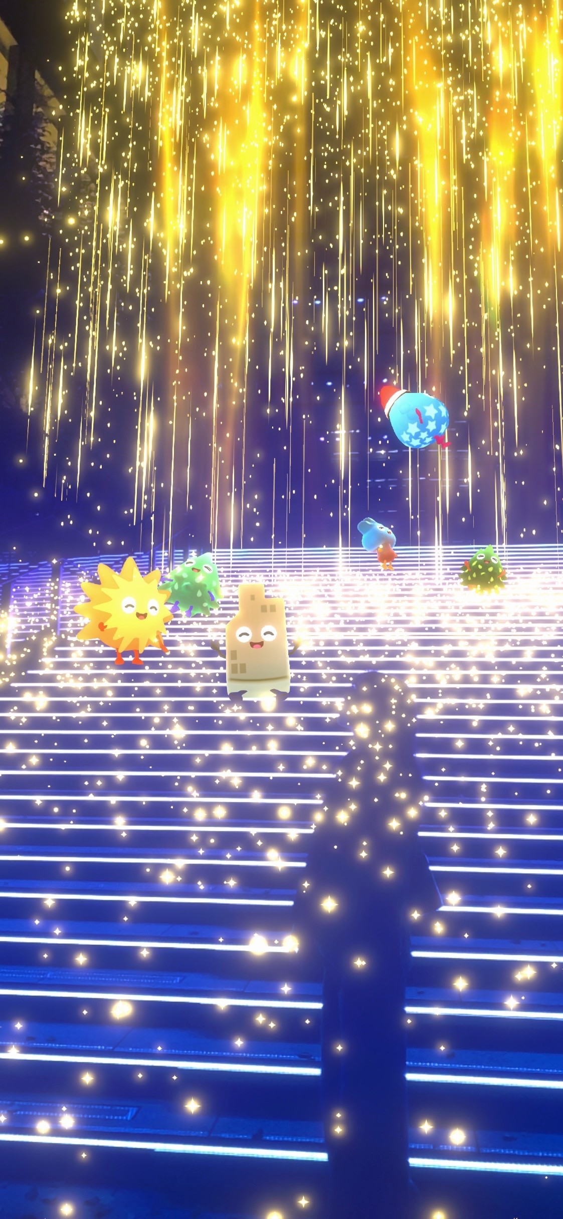 カラフルな光の滝が流れ落ち、ミナモンと仲間たちがニコニコしながら階段でお出迎え。ぴょんぴょん飛び跳ねながら遊んでいて、人間の世界を楽しんでいるみたい。