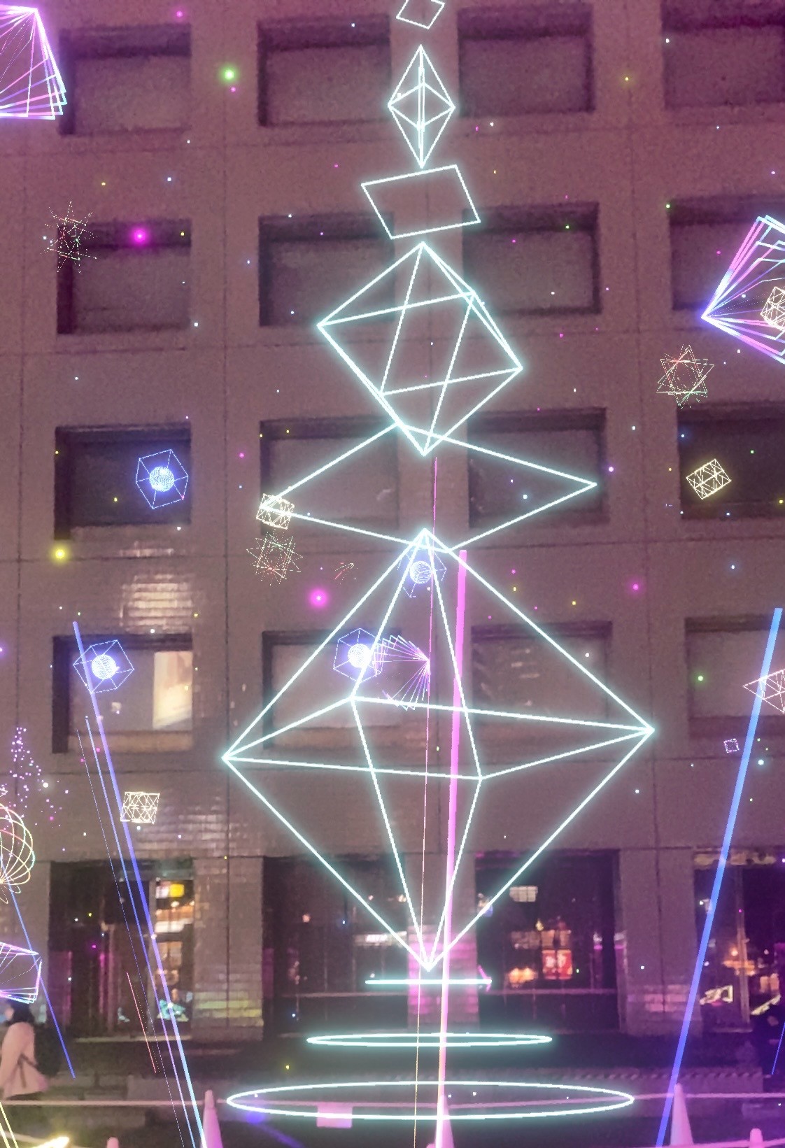 1つめのスポットとはまた雰囲気の違う巨大XRツリーがドーンと輝き、遠くに見えるオフィスビルの灯りもイルミネーションの一部みたいに溶け合って、特別な夜の景色に。