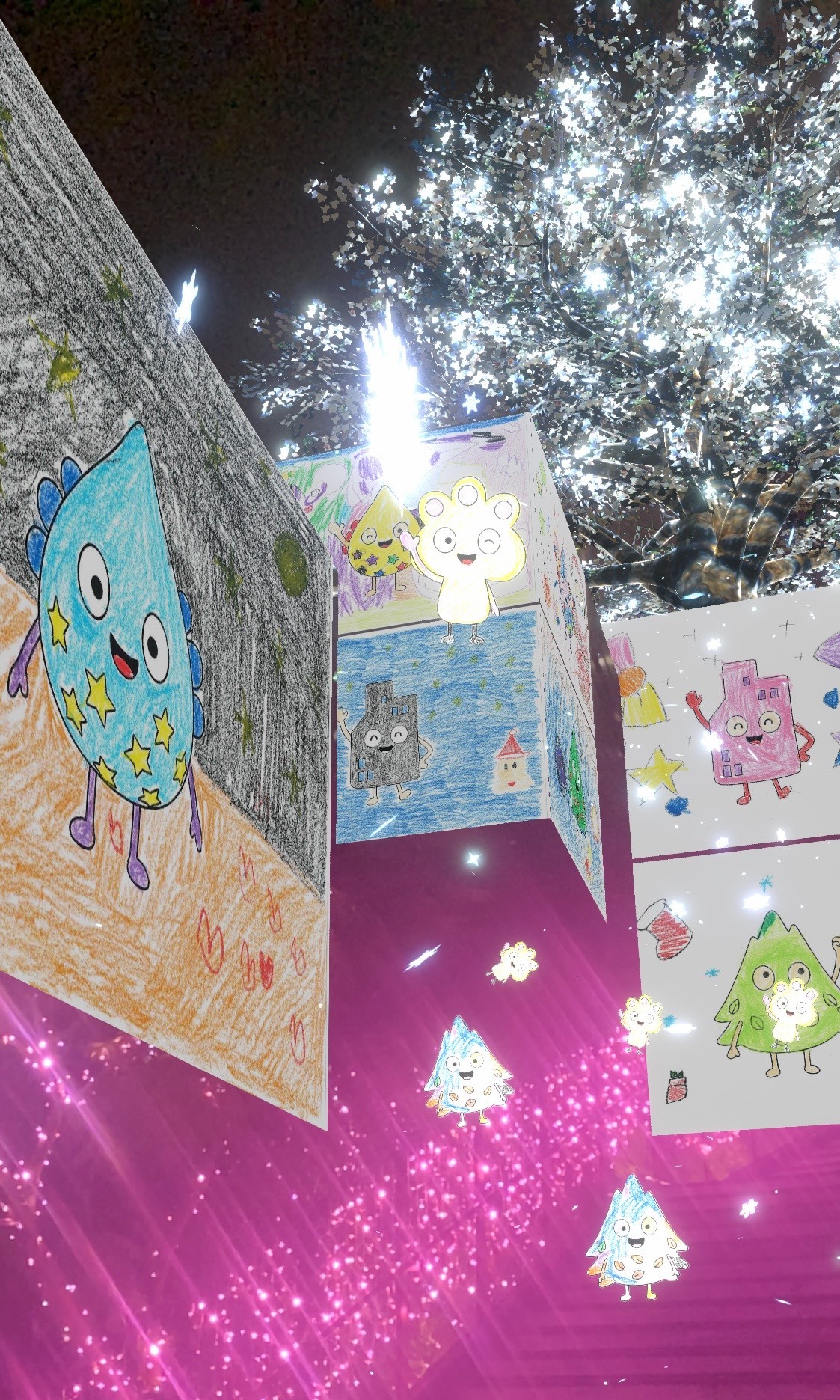 10月に「ミナモンときらきらクリスマス」をテーマにした塗り絵を子どもたちから募集。想いを込めて描かれた絵が、ここから見えるオフィスビルの壁面に映し出され、カラフルなXRギャラリーに大変身!