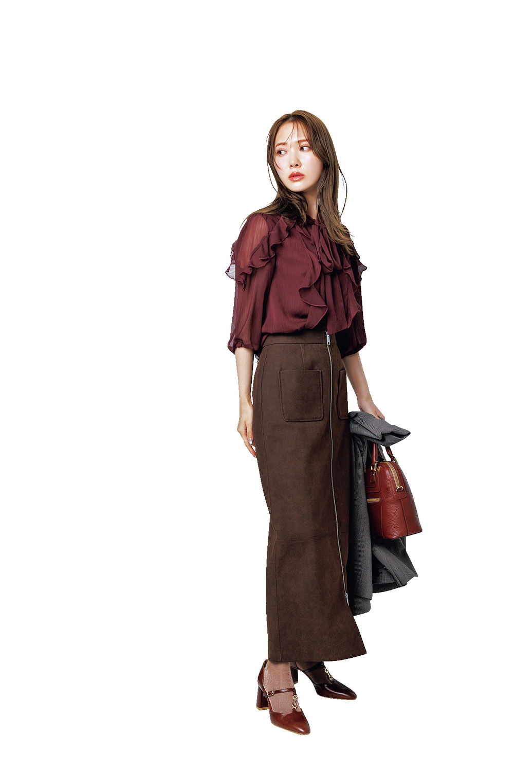 エレガントなフリル使いが華やかな1枚。大人な肌見せが叶うバーガンディカラーのシアー素材に、スエード調のブラウンタイトで品よく色気を醸して。