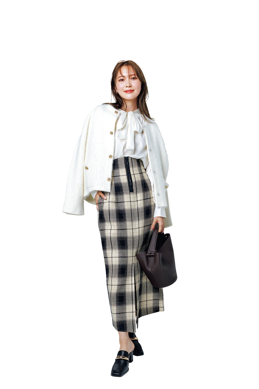 リッチなツヤ感のある白ボウタイ&ふわふわ白ジャケットは、すらっとしたタイトスカートでメリハリ美人に!