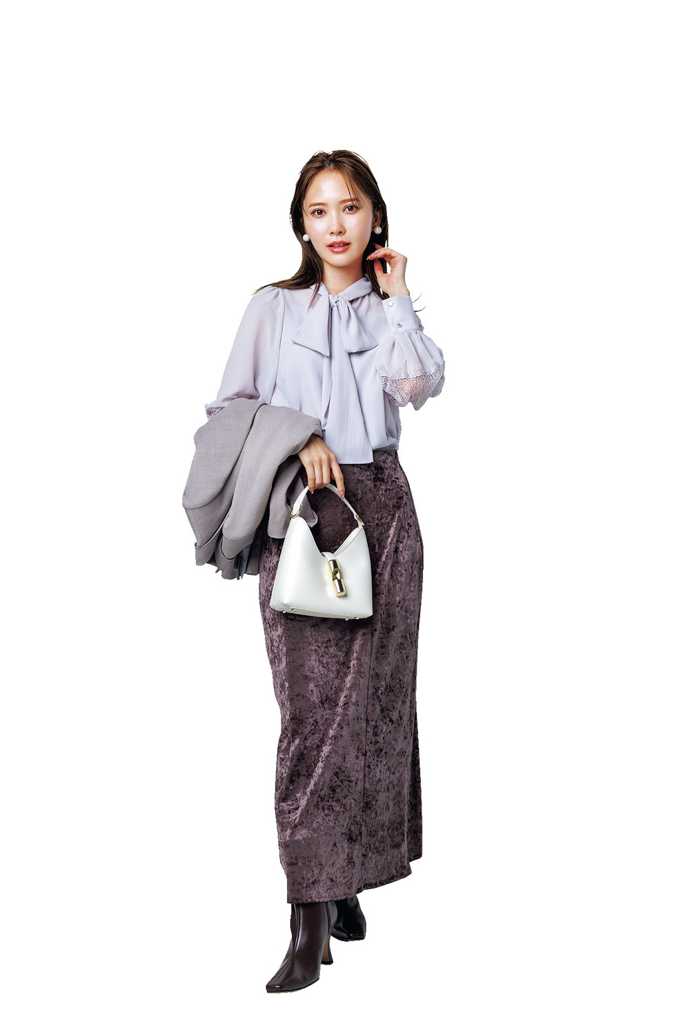 秘書役ならではの洗練された好感度コーデは、憧れの的! ほんのり色気を醸すとろみボウタイに、×タイトスカートでメリハリをきかせてヒロイン級の美スタイルをメイク。