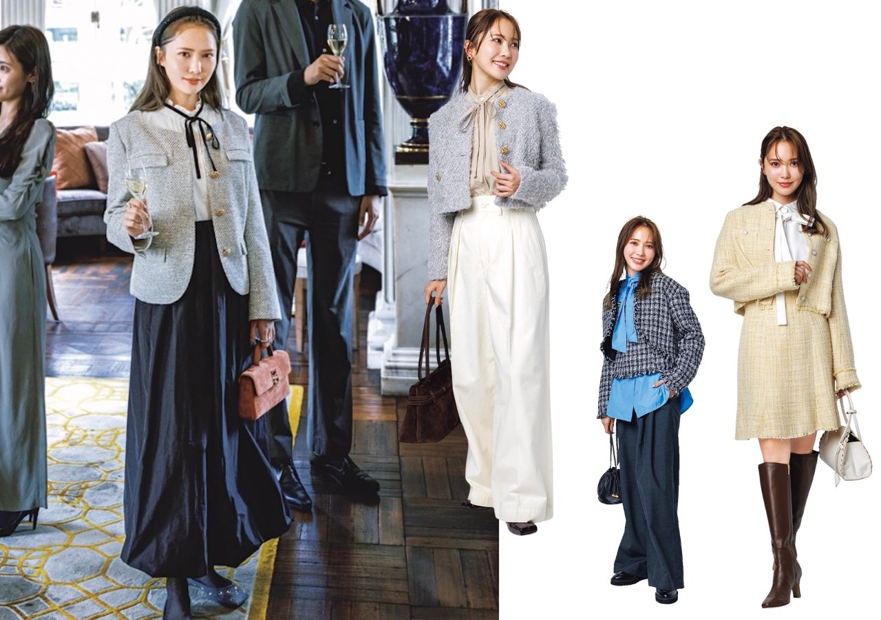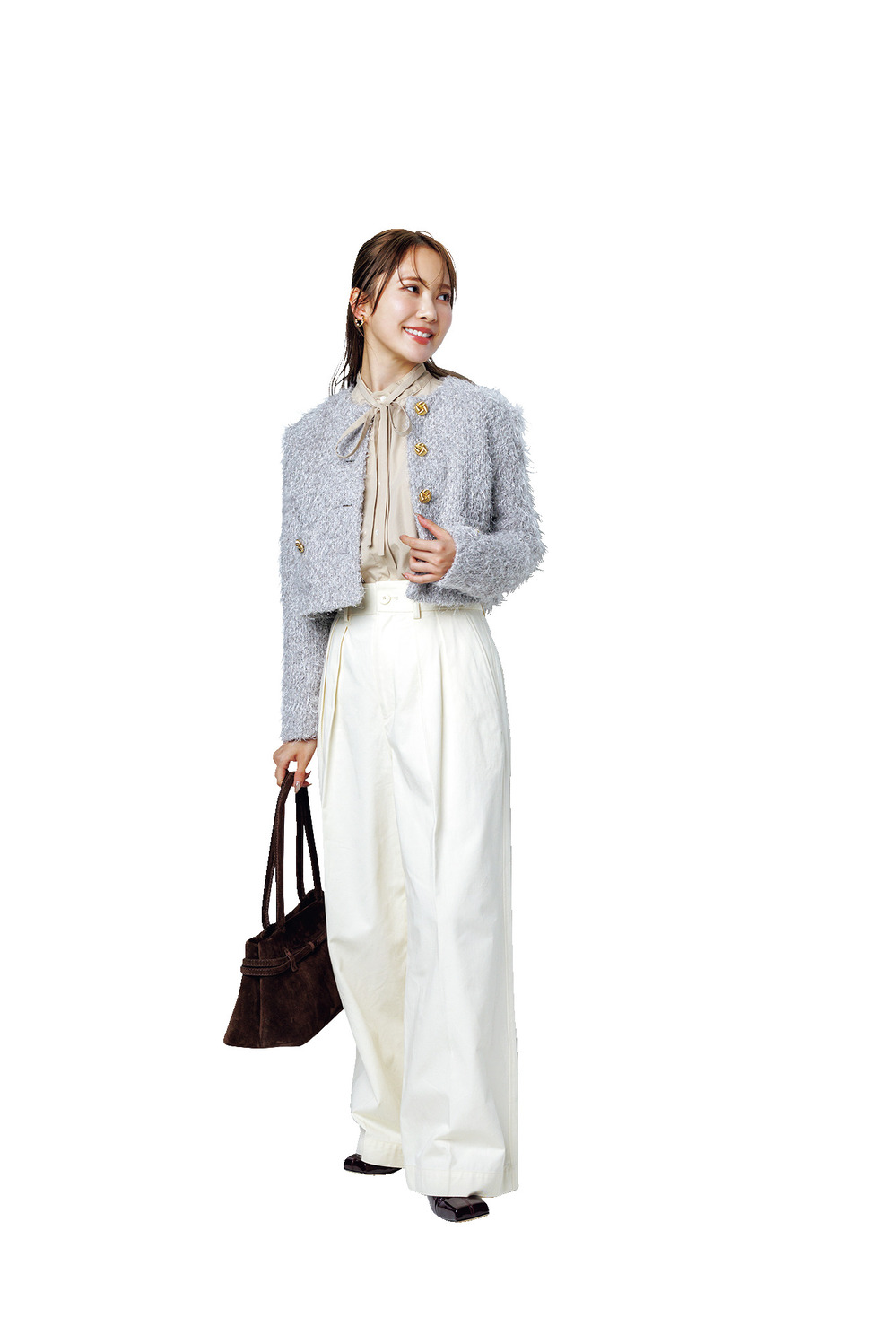 芯のある強さと優雅なかわいさを両立する財閥令嬢風のファッションに欠かせないのが、ツイードジャケット。華奢なボウタイブラウスをINして、グッと可憐なムードに。