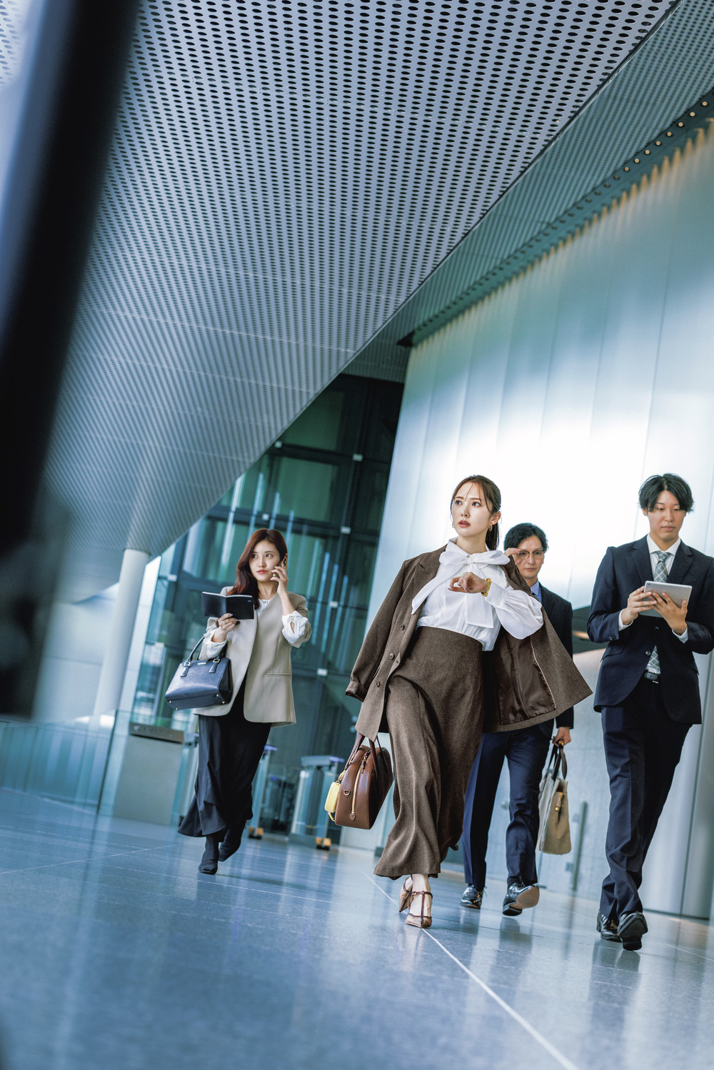 スマートで女っぽくて、カッコいい! バリキャリ女子風コーデはセットアップがユニフォーム。華やかできちんと見えするハリ感ボウタイを合わせれば、目を引く存在感も自信も高まる。