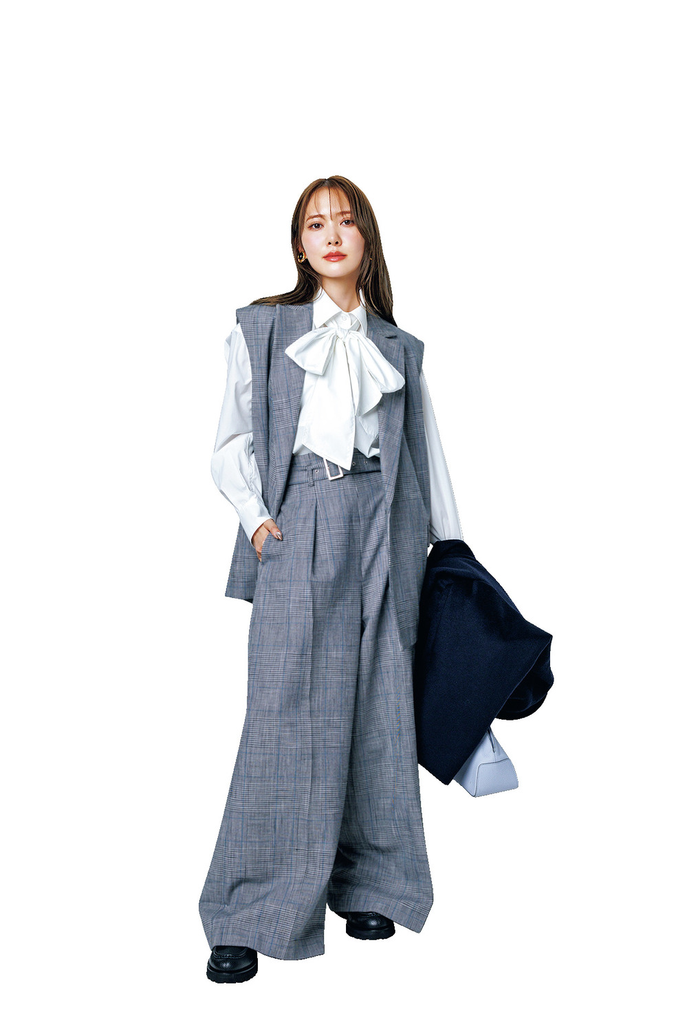 ピュアな白ブラウスは、存在感大のビッグリボンがドラマティック。モードなジレ×ワイドパンツのタッグで媚びない華やかさを。