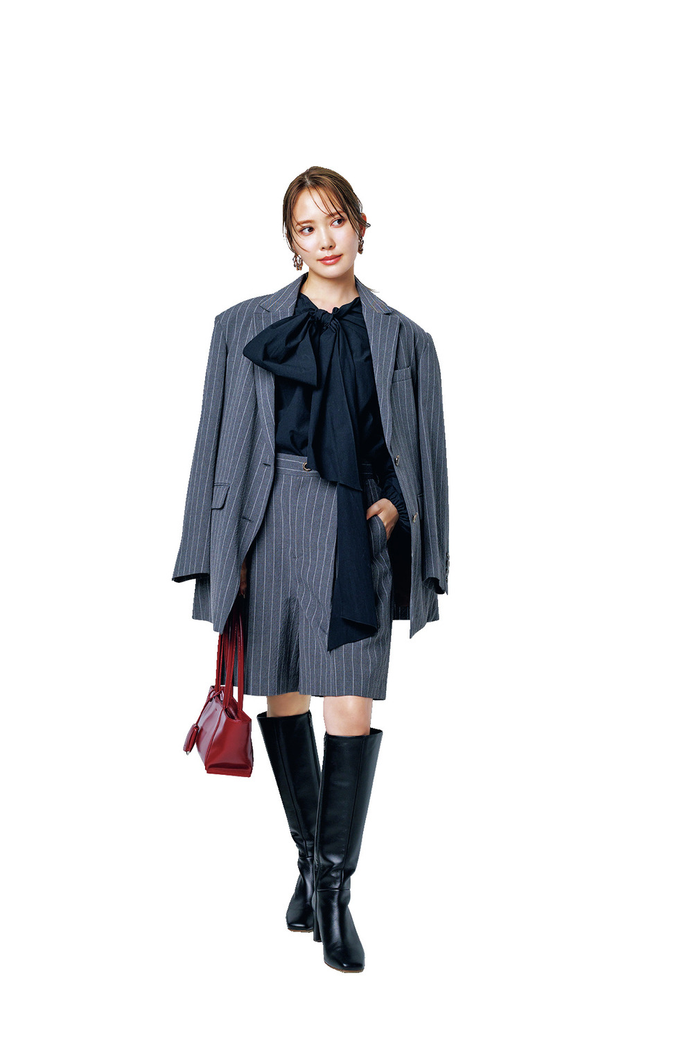 マニッシュなジャケット×スカートのセットアップには、清楚な白ブラウスを合わせて知的な華やかさをプラス。ビッグサイズのボウタイも、ハリ感のある素材ならキレよくまとまる。