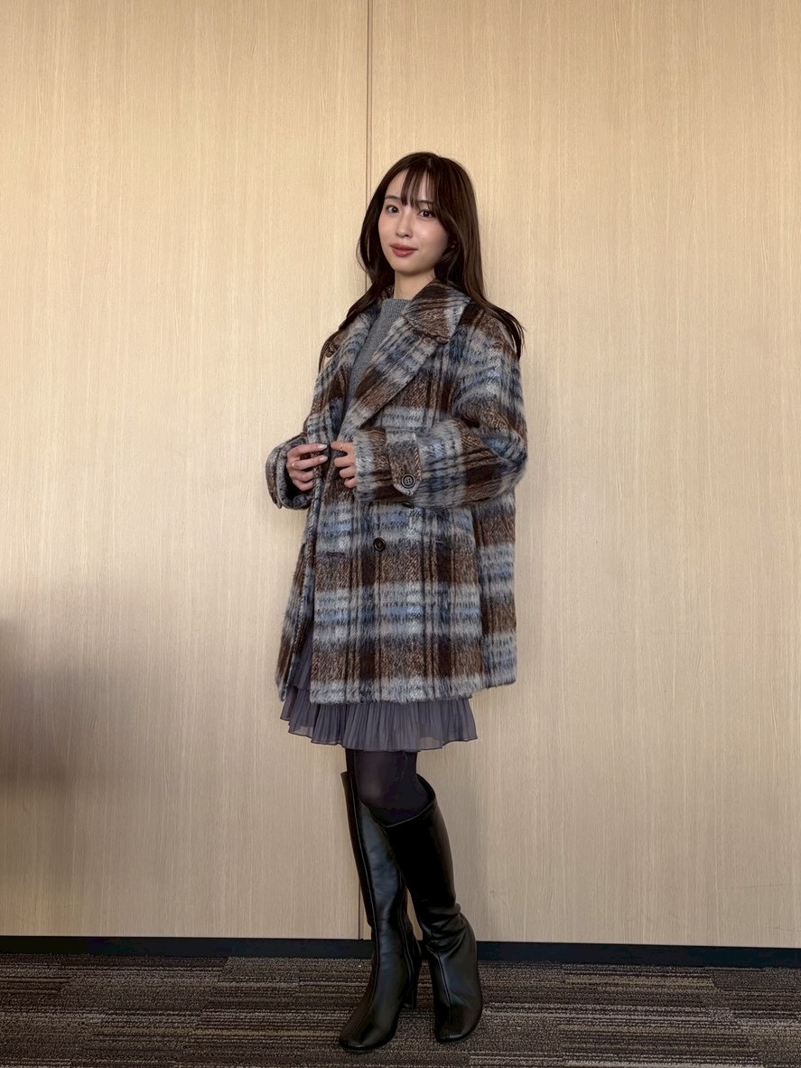 ■12/8(月)/チェック柄コート×グレープリーツミニスカート