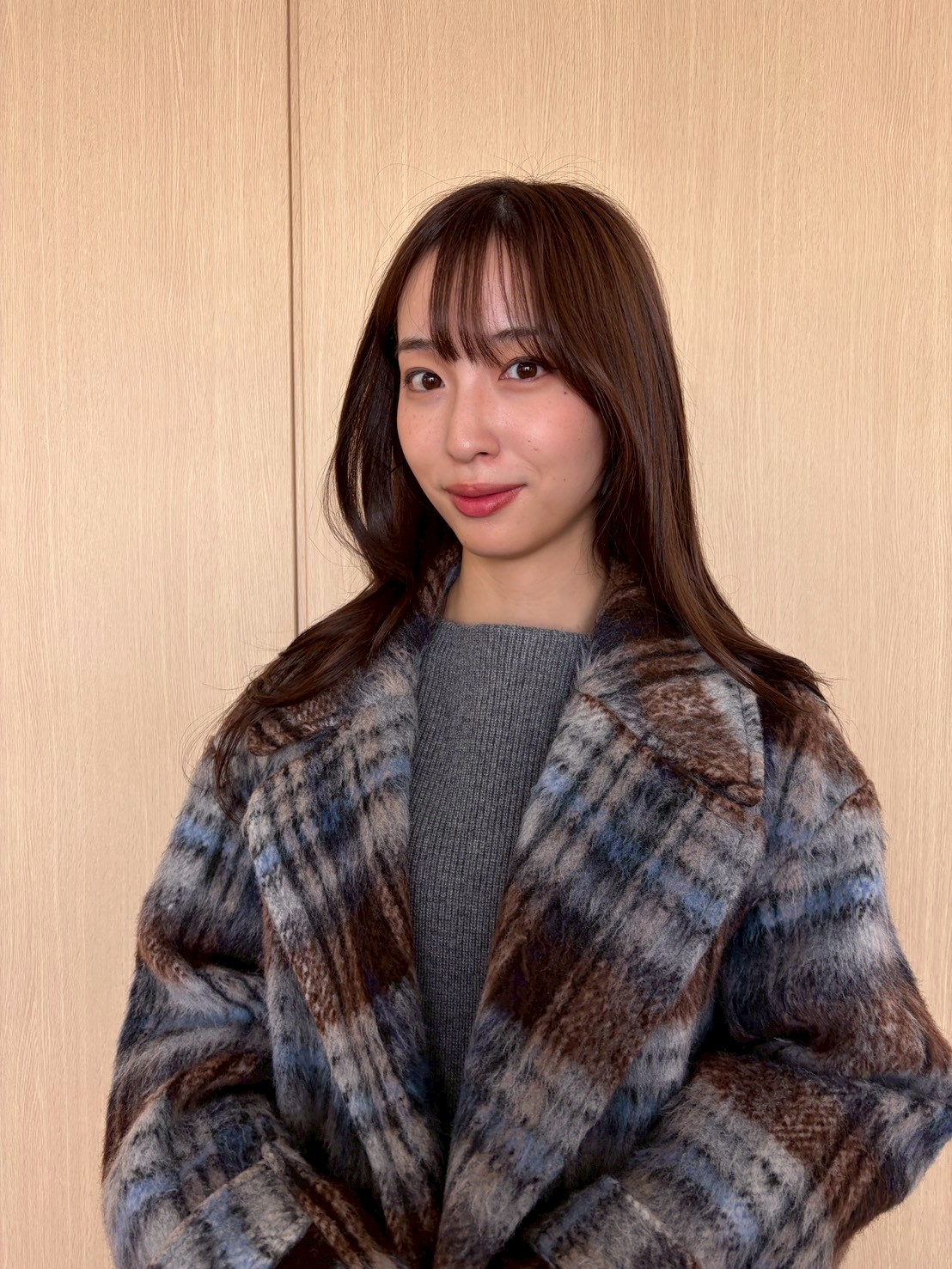 シャギー素材のアウターはチェック柄を選んで存在感を【林さんのブラウンショートコート着用画像6枚】