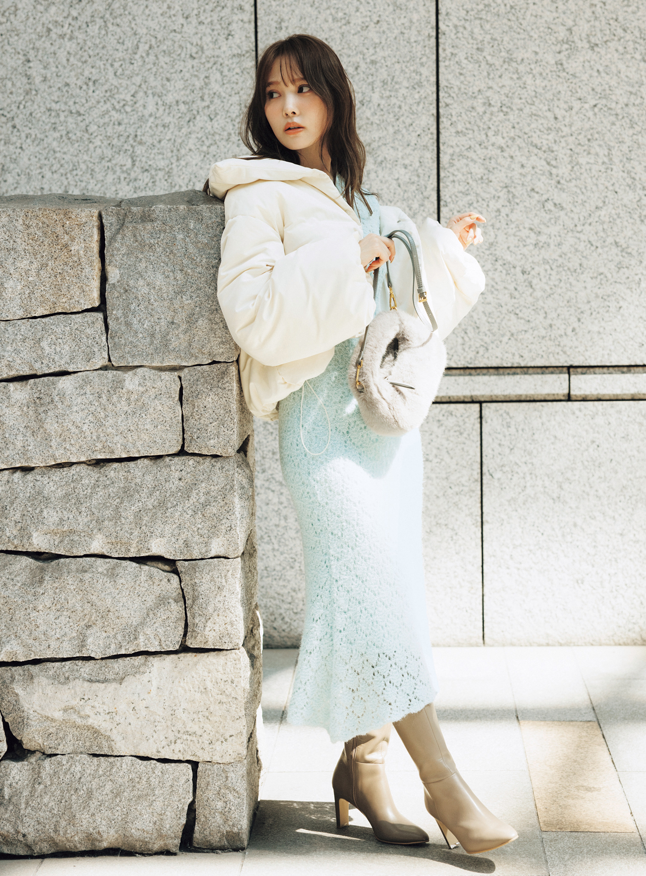 ふかふかダウンがほんのんりセンシュアルなワンピの甘さを引き立てる