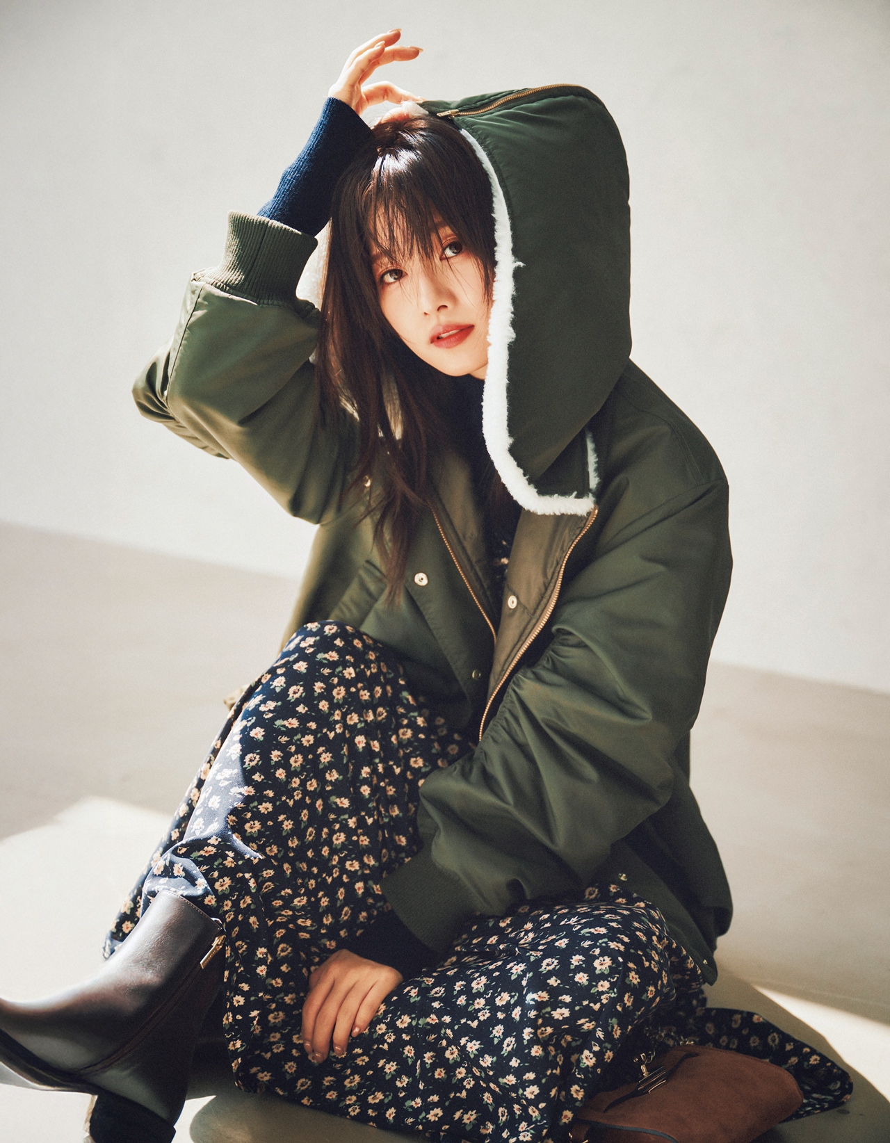 オリーブカラーのブルゾンを小花柄ワンピにばさっと合わせると、甘さが軽減してこなれたヴィンテージ風スタイルが完成。フードをかぶったときに、顔周りに白ボアがちらちら見えるのフェミニンなワンピとの繋ぎ役に最適です。