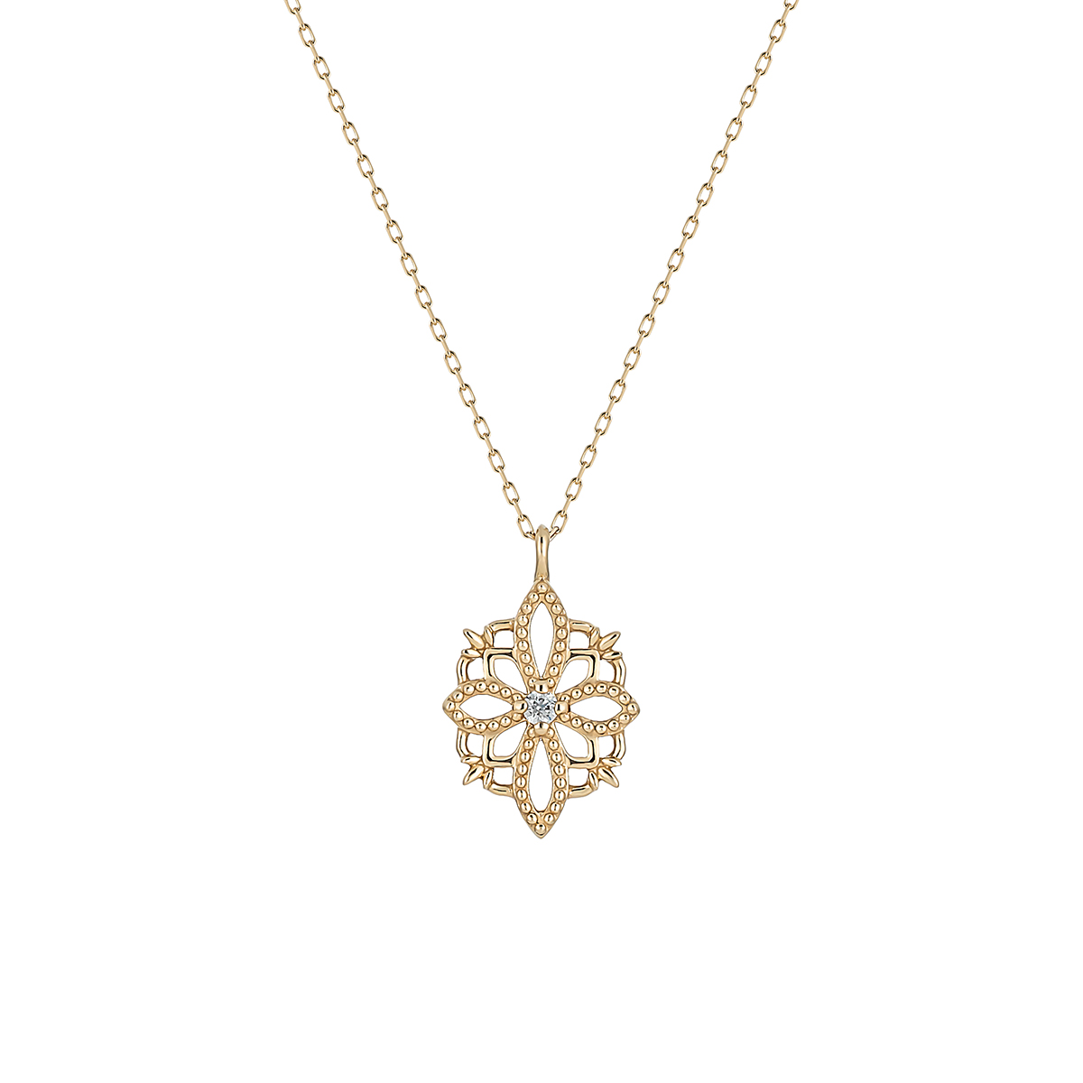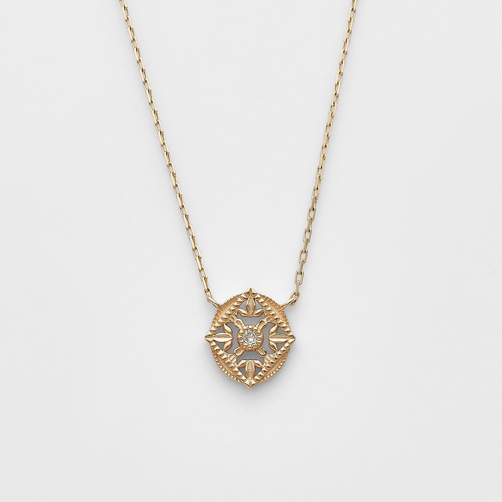 祈りを捧げる教会のステンドグラスのローズウィンドウにインスパイアされた、透かし模様のネックレス。センターに置かれたダイヤモンドが、厳かな教会の静けさをそっと映し出し気持ちまで清らかに。繊細でやさしげなザインのネックレスに祈りを込めて♡