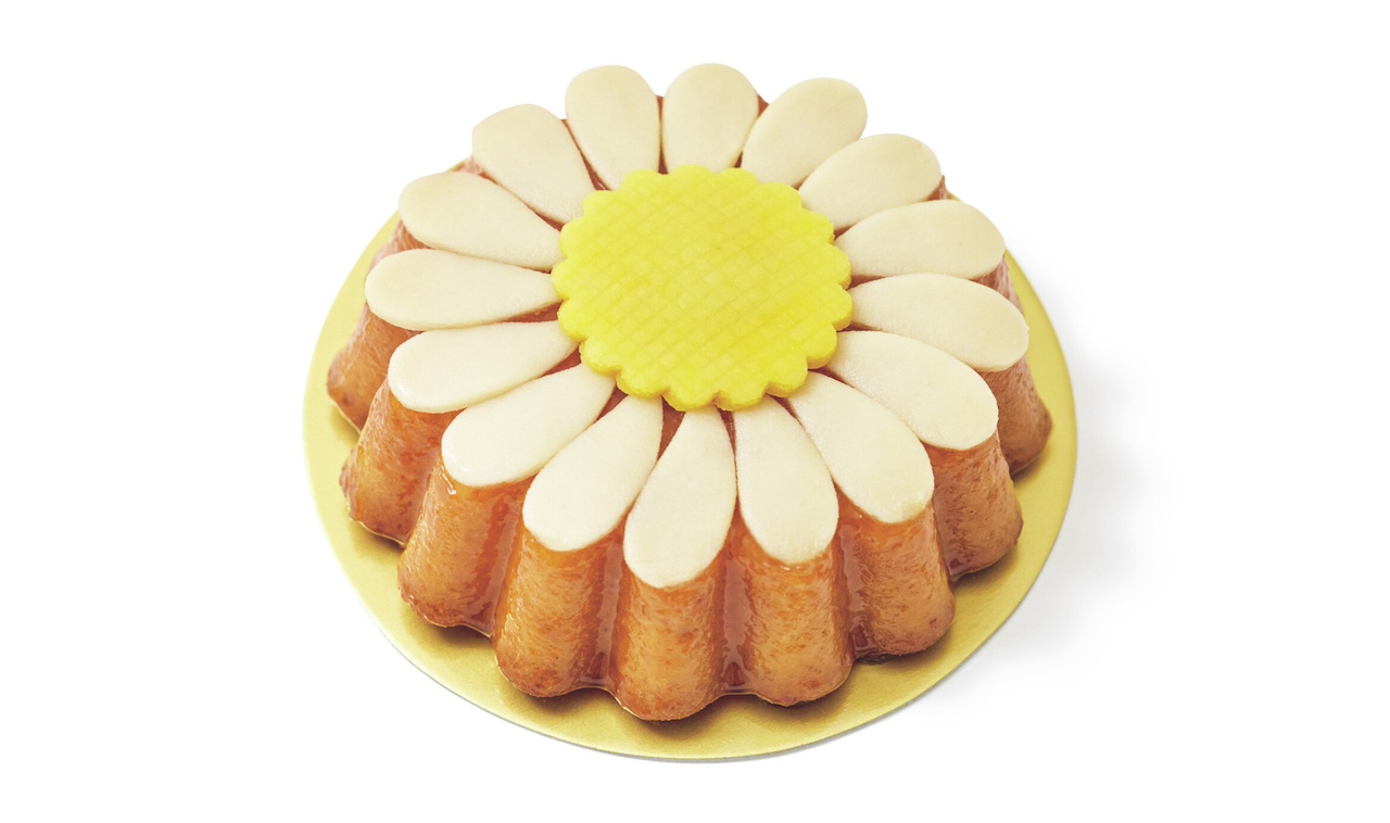 マーガレットを模したケーキは、バターとマジパンを使ったしっとりとした生地。おいしく食べられる期間が約12日と長めなのもセレクトしたくなる理由。ほんのり酸味を感じる杏子ジャムコーティングが利いている!