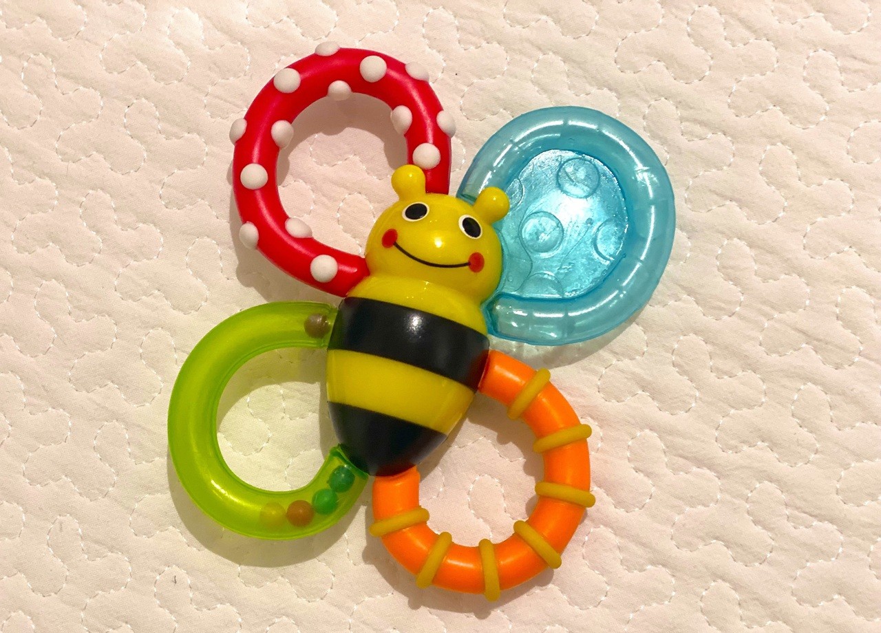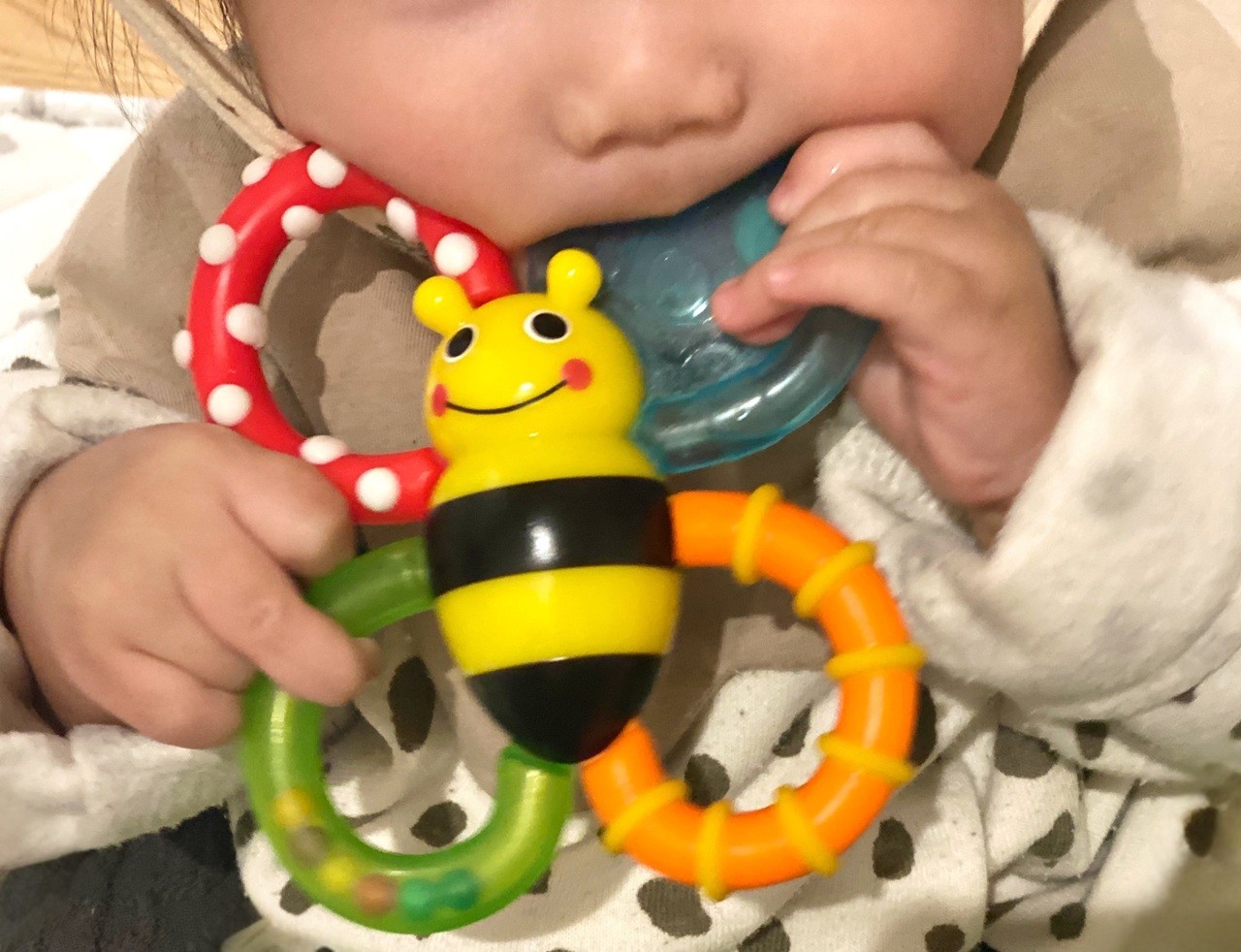 右上の水が入った羽は、ほかよりムニムニと柔らかく、噛み心地がいいのか姪っ子のお気に入り♡ママ目線でも「原色使いで目に留まりやすくパッと見せるだけですぐに興味を示してくれるから、機嫌がよくなって助かる」とのことです。さらに、冷蔵庫で冷やして使うとひんやり気持ちいい!