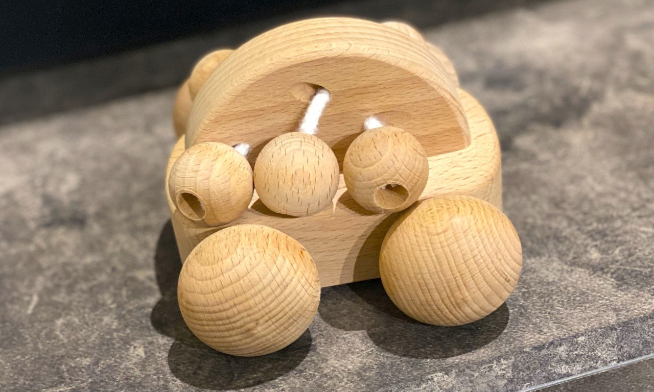 ころんとしたフォルムと、木そのもののぬくもりが愛らしいオルゴールカー。ナチュラルな木素材なので、遊んでいない時間もお部屋のインテリアとして自然になじみます。