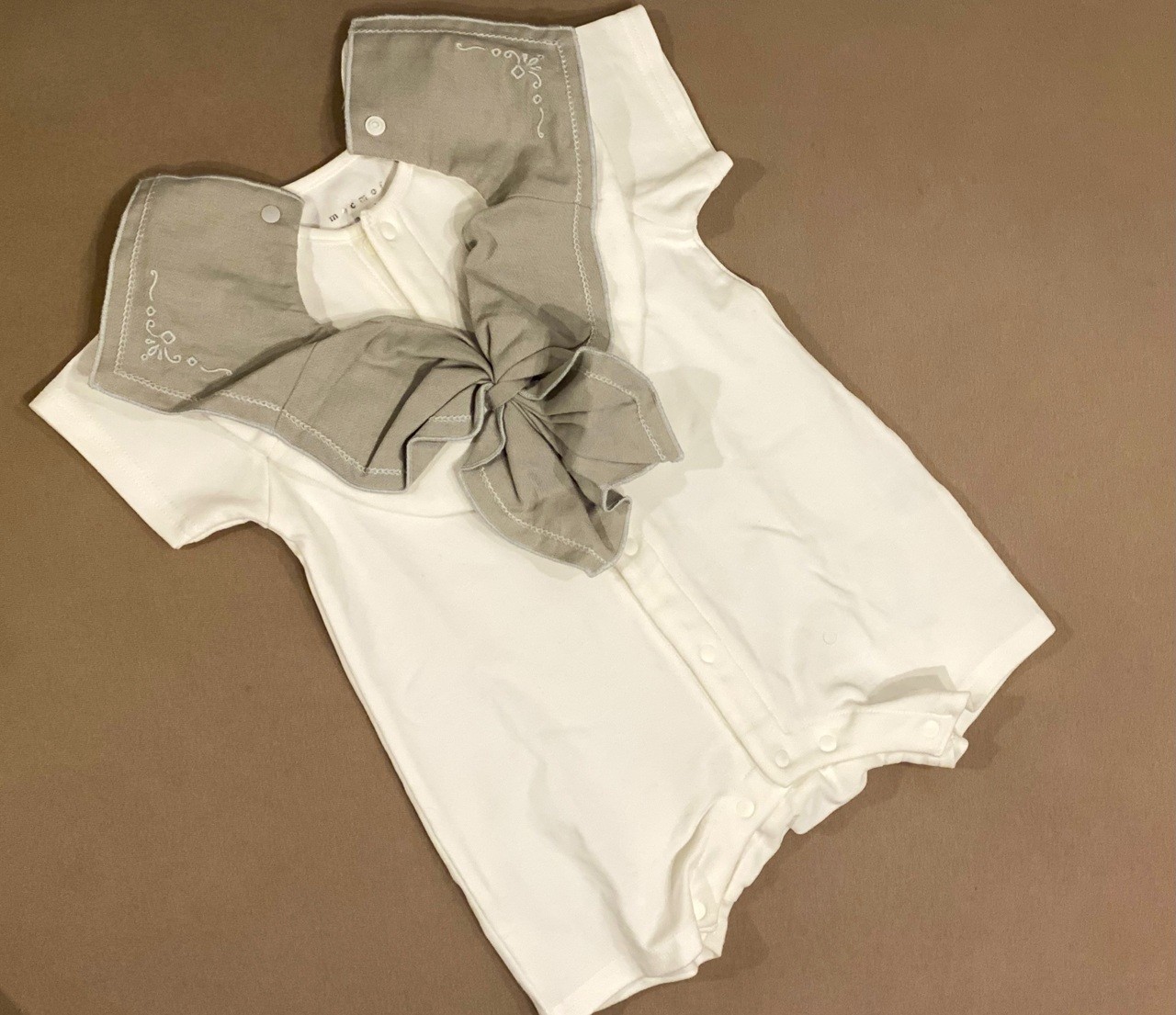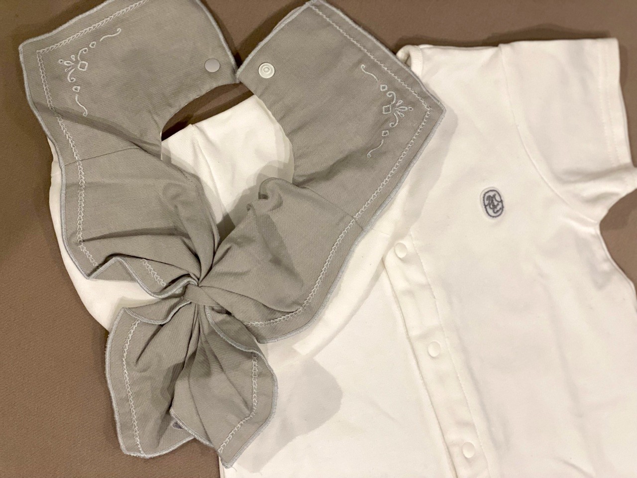主役は、くすみグリーンのスカーフ風付け襟。立体感のある結び目リボンがほどよく華やかで、甘さを抑えたニュアンスカラーがホワイトのロンパースと相性抜群。クラシックさの中に、今っぽさも感じられるデザインです♡