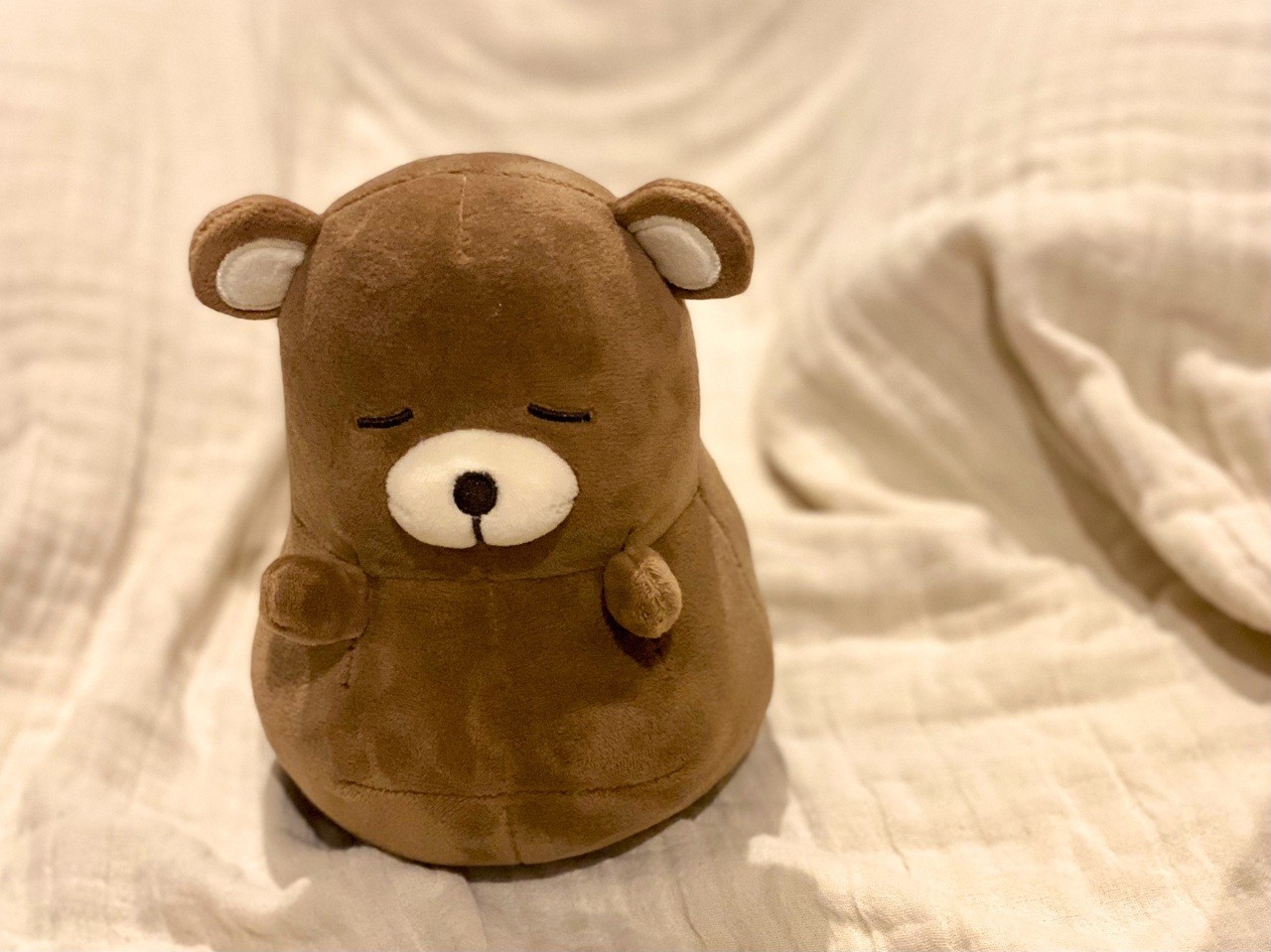 スヤスヤ眠っているような表情のクマは、実はただのぬいぐるみではなく“おきあがりこぼし”仕様。揺らすたびに「コロンコロン♪」とやさしい音が鳴るんです。