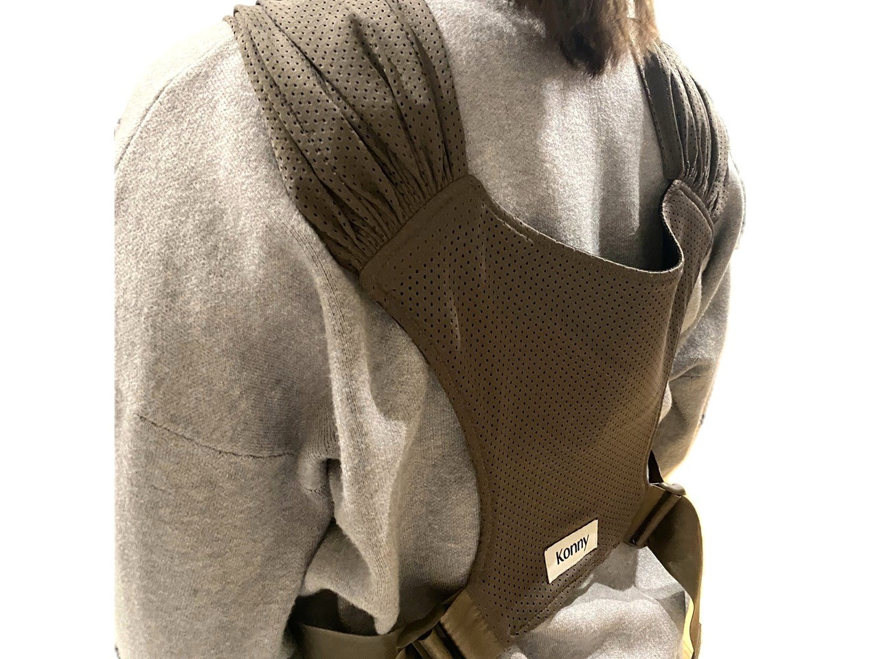 一般的な抱っこ紐は、がっしりとしていて重かったり、着けると窮屈に感じてしまうことも多いですよね。でもこれはベルトや大きなバックルがなく、とにかく軽い。薄くて伸縮性のある素材が体にフィットし、ママの肩や首への負担も感じにくい構造になっているのが特徴。