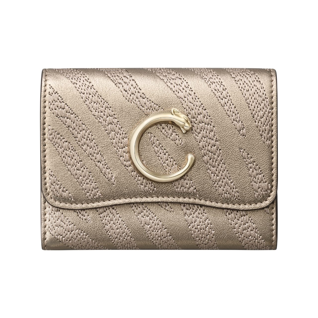 特別な日に手にしたいのは、まばゆい光を放つメタリックゴールドのウォレット。このモデルの魅力は、なんといってもラムスキンに施された繊細なパンテールの刺繍。プリントでは表現しきれない立体的な陰影が、手に取るたびに優雅な奥行きを感じさせてくれる。
