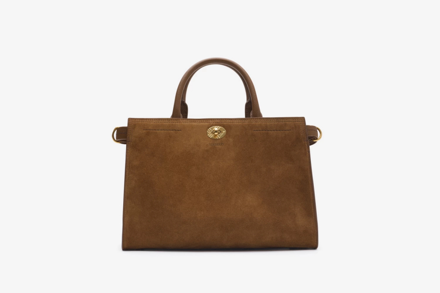 トレンチコートのベルトから着想したレザーストラップとDリングが、さりげなくバーバリーらしさを主張。ストラップは取り外し可能で、きちんと感を出したい日は手持ち、荷物が多い日はショルダーやクロスボディにと、シーンに合わせて使い分けられる。ひと回り小さなミニサイズは、小柄な方でもバランスよく持てて印象も軽快。