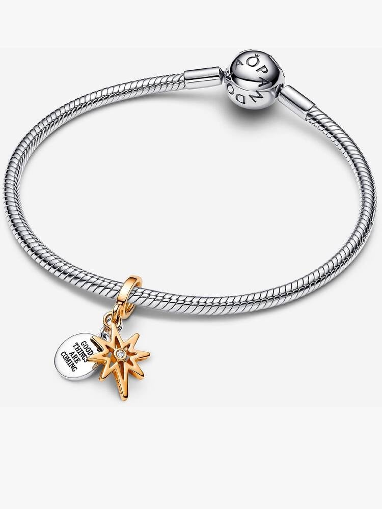 スターリングシルバーのクラシックなブレスレットに、14Kゴールドプレーティングの北極星チャームをセッティング。「GOOD THINGS ARE COMING」というメッセージが刻まれたディスクは、刻印可能な仕様に。おそろいで身につけたふたりには、素敵な未来が待ち受けていそう♡ 別売りのチャームでカスタマイズも楽しめる。