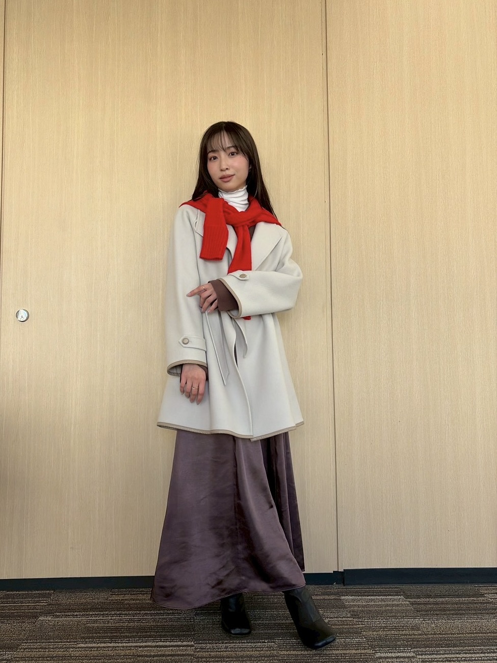 こなれ感が出るカーデの肩かけは、クリスマスカラーの赤をチョイス!【林さんのアイボリーコート着用画像4枚】