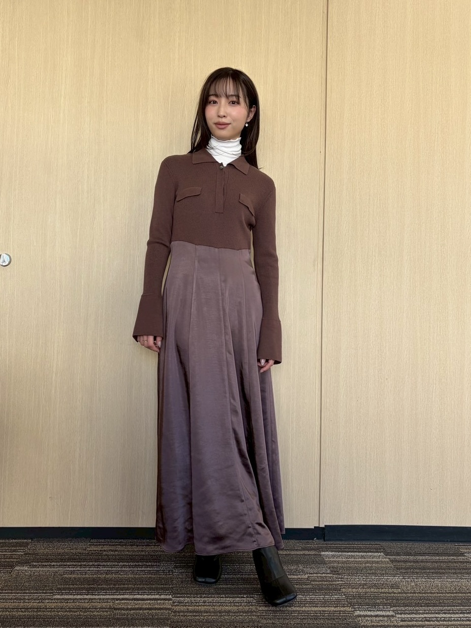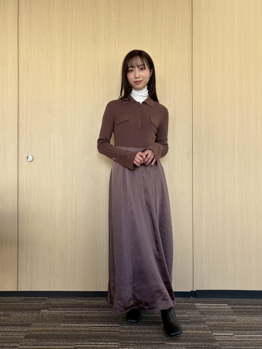 鮮やかな赤ニットを肩がけして、ワクワクとしたクリスマス気分をひと盛り! コートの中は艶めく風合いが目を引くドッキングワンピをIN。上品なブラウンも手伝って、特別感のあるおしゃれが完成♡