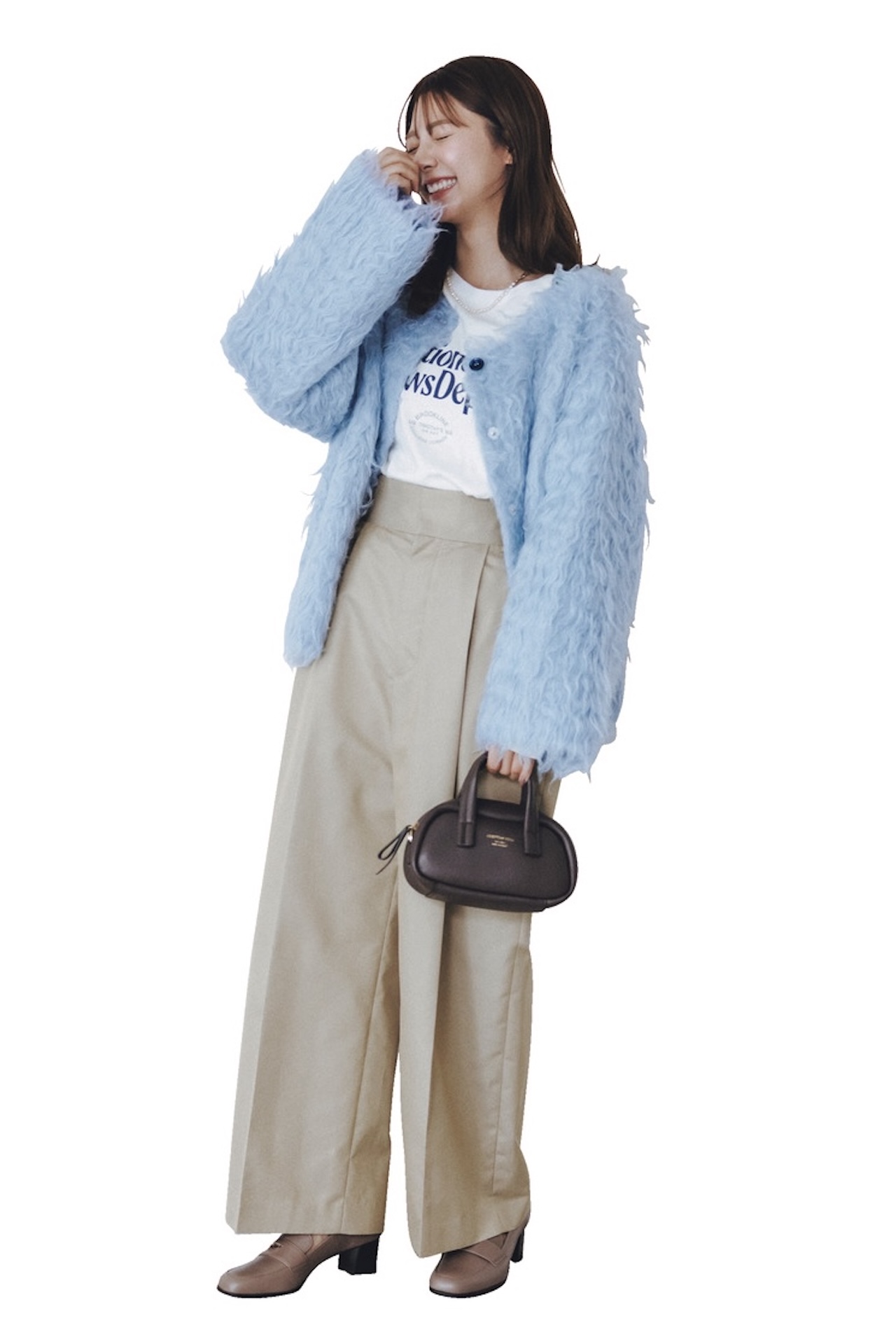 ドライブなど慣れてきた3回目以降のお出かけは、質感&色がやわらかなカーデをロゴTでアクティブに。優しくて快活なオーラをまといたい!