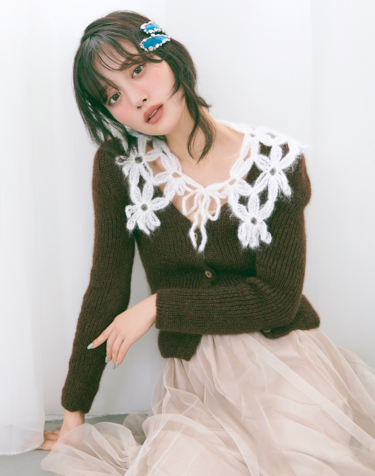 ビジューでトリミングされたヴィンテージムードなヘアピンは、つけるだけでロマかわ♡ あたたかみのあるニット素材のレース襟を重ねて、顔周りを華やかに盛り上げて。ボトムは淡ピンクのチュールスカートでレディに。