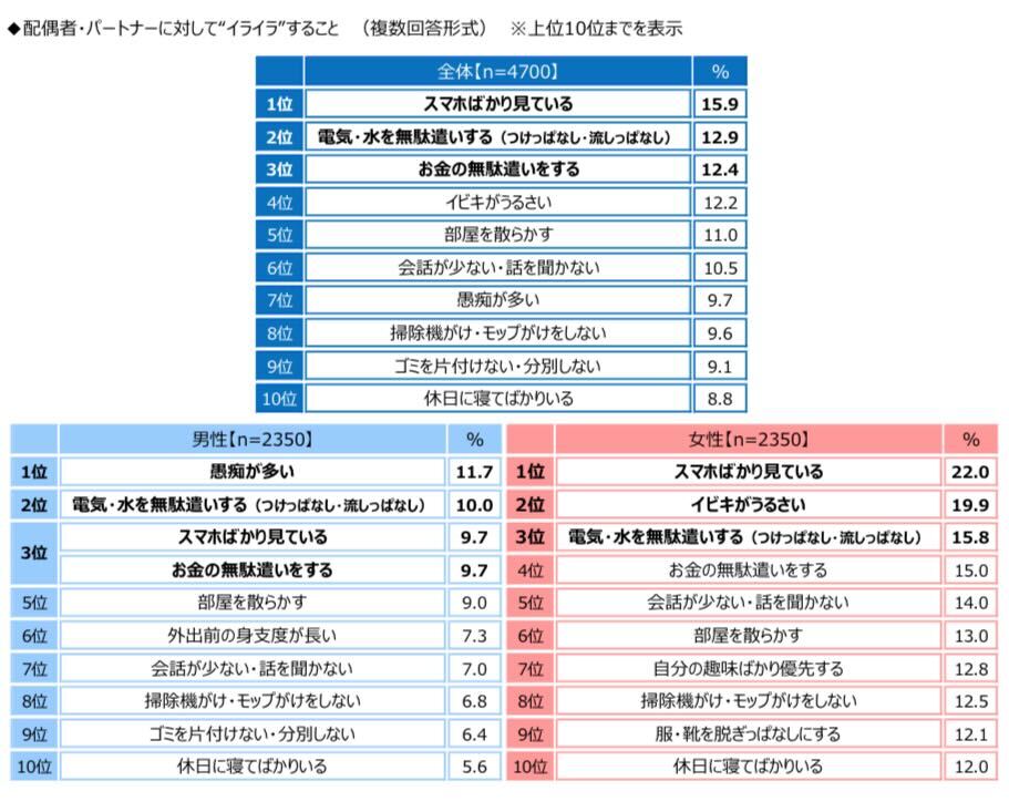 配偶者・パートナーに対して“イライラ”することを聞いたところ、