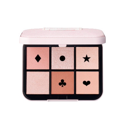 ①Aのベージュパレットの★をアイホール全体に広めにのせ、♦と♥をMIXしてアイホールにレイヤード。♣を目のキワに入れてグラデーションを作る。下まぶたには●と♥をMIXしてすっと引く。