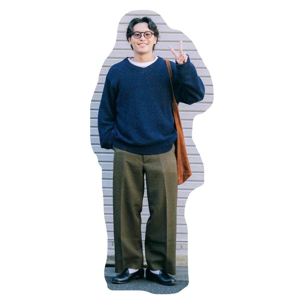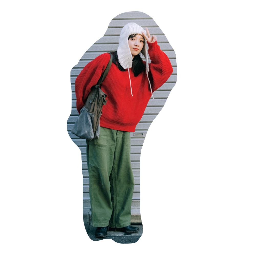 意図せずメロンソーダカラーなコーデだったかおこさん。シンプルなゆるっとニットに太めのパンツでお互いのシルエットをリンク。