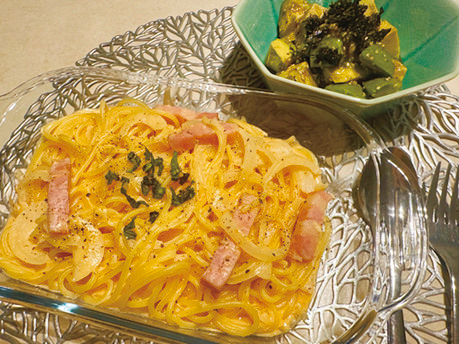 「ロゼパスタとアボカドの韓国のり和えです。コチュジャンでピリ辛にしつつ、牛乳を入れてクリーミーな韓国風パスタにしました。アボカドはおつまみにもピッタリ!」