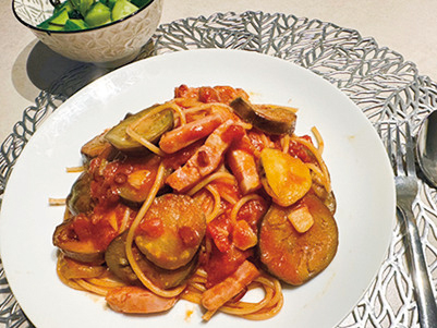 「茄子のアラビアータを作りました。辛いものが食べたいなぁという日に、大量の鷹の爪を入れてよく作ります。タバスコをびちゃびちゃにかけて食べるのが好きです」