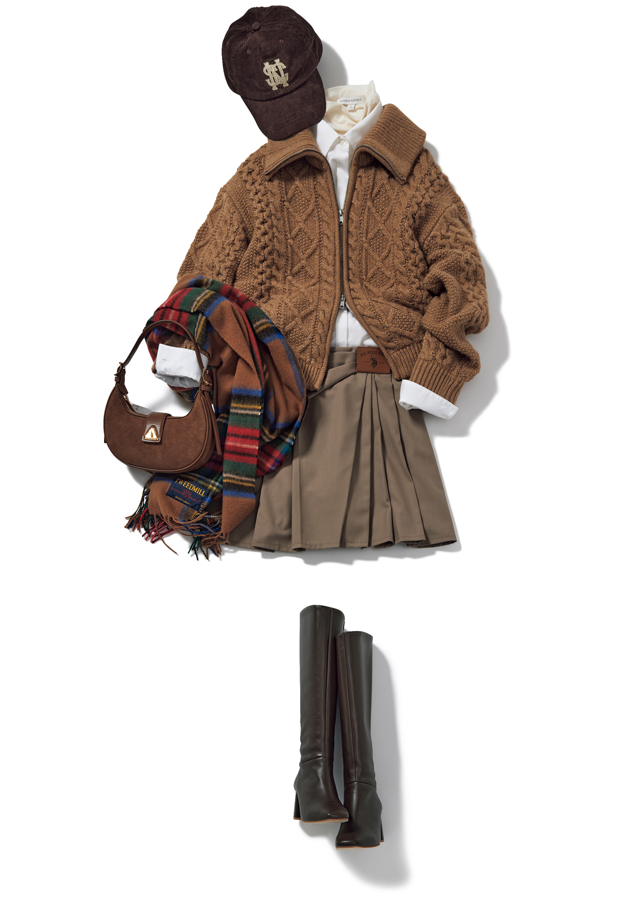 スカート[U.S. POLO ASSN.別注]¥14,300(MERCURYDUO ルミネエスト新宿店〈MERCURYDUO〉)、ニット¥3,990(GU〈GU〉)、シャツ¥18,700(LOUNIE/ルーニィ)、中に着たプルオーバー¥12,000(バナナ・リパブリック)、バッグ¥10,900(CHARLES & KEITH)、靴¥42,900(ダイアナ 銀座本店〈ダイアナ〉)、帽子¥6,600(フリークス ストア渋谷〈ノーティカ〉)、マフラー¥13,970(セムインターナショナル〈TWEEDMILL〉)