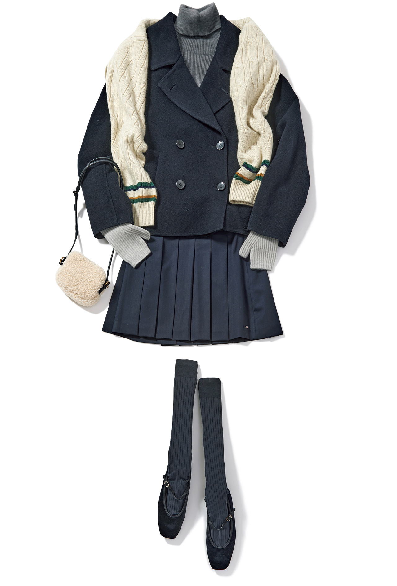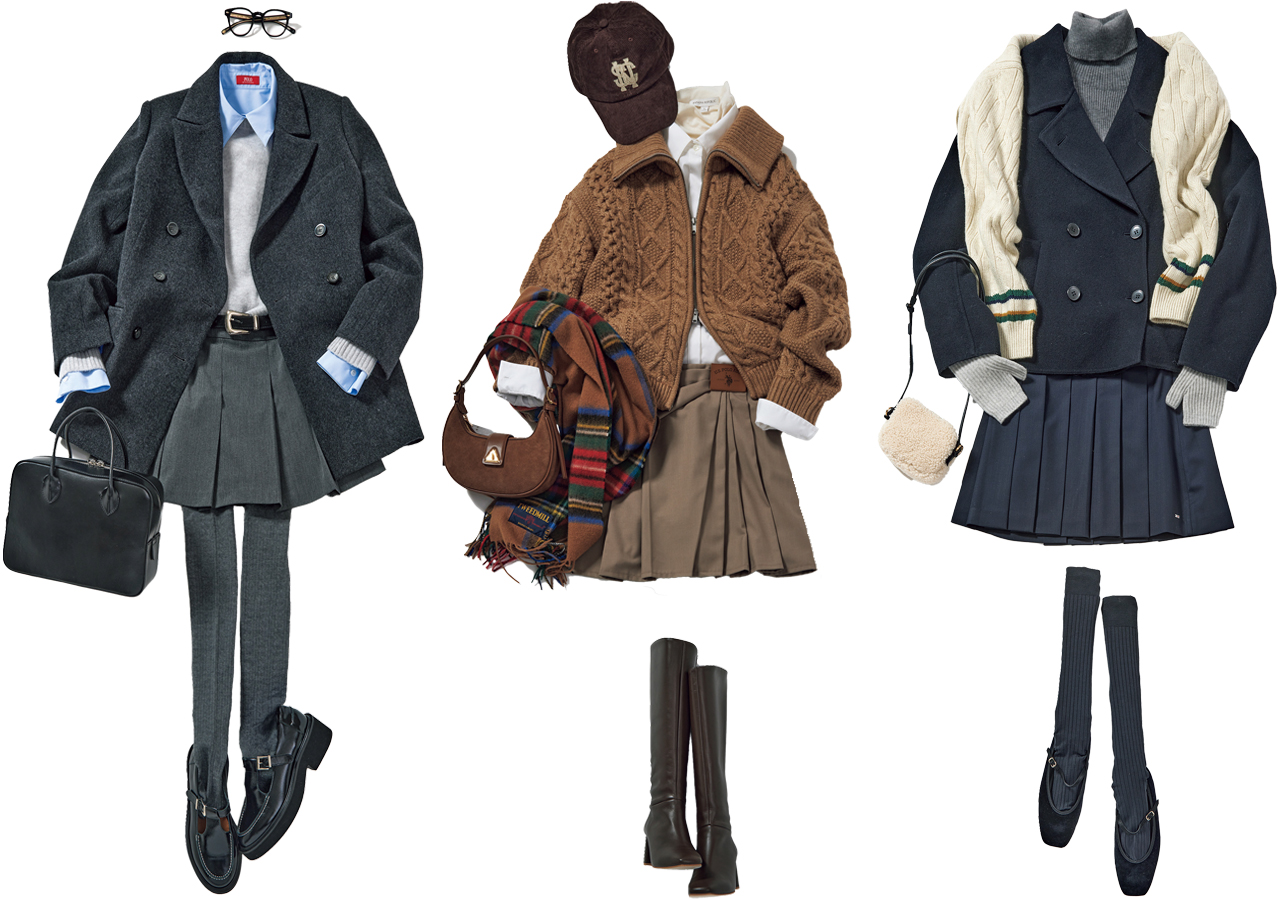 「ロングのプリーツスカートもトレンドですが、プレッピーなコートやニットに合わせるならミニ丈のほうがキレよくハマってオススメ。ほっこりしがちなニットアイテムも、ミニのプリーツスカートとなら洒落感たっぷりに着こなせて◎」(奥富さん)