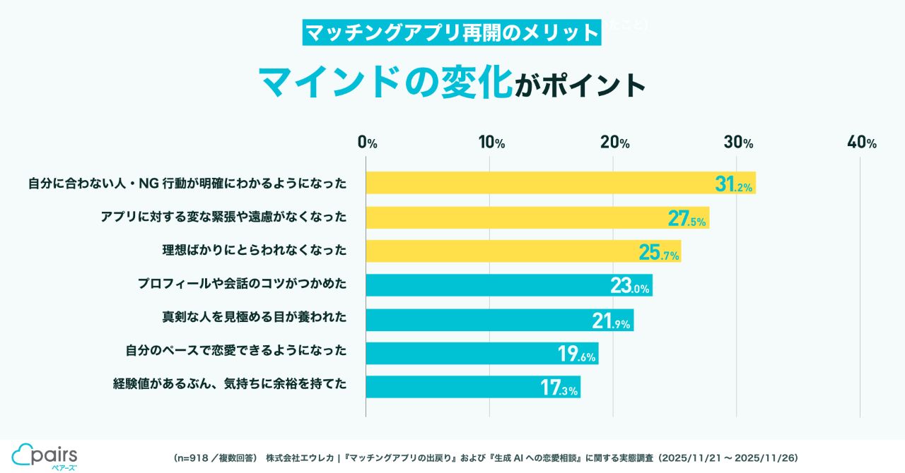 また、アプリの利用を再開して感じた、過去の利用経験が生きたメリットについて尋ねたところ、回答のTOP3は「自分に合わない人・NG行動が明確にわかるようになった」(31.2%)、「アプリに対する変な緊張や遠慮がなくなった」(27.5%)、「理想ばかりにとらわれなくなった」(25.7%)でした。
