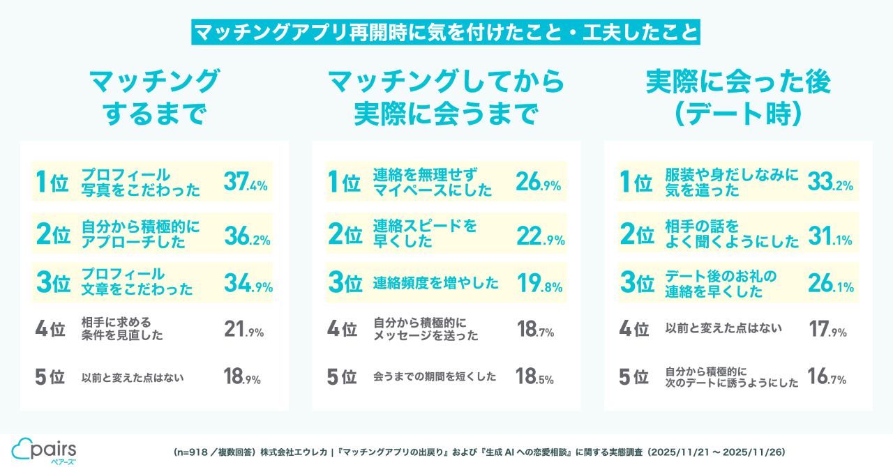 それぞれのシーン別で調査! まずマッチ前に最も気をつけた、工夫したポイントは「プロフィール写真をこだわった」(37.4%)でした。続く、実際に会うまでのシーンでは「連絡方法を無理せずマイペースにした」(26.9%)、デート時では「服装や身だしなみに気を遣った」(33.2%)がトップでした。