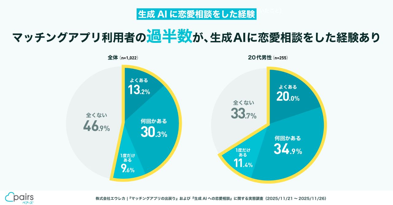 「よくある」(13.2%)、「何回かある」(30.3%)、「一度だけある」(9.6%)と、生成AIの利用経験者が過半数(53.1%)でした。特に20代男性は7割弱(66.3%)が生成AIに対する恋愛相談済み!