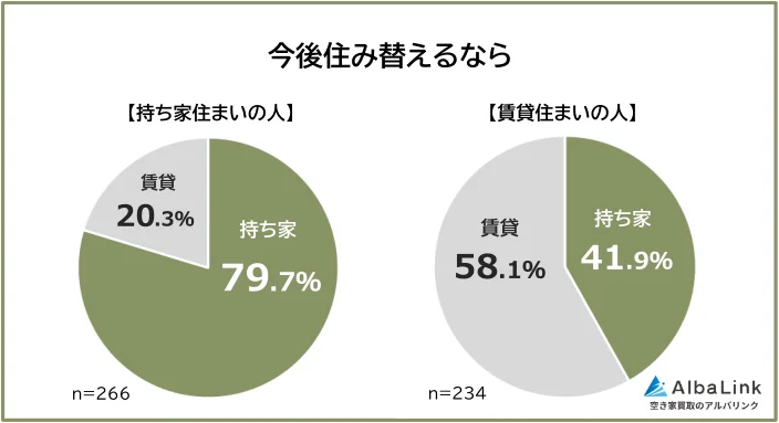 一方で賃貸住まいの人では、「住み替えるとしても賃貸派」が6割ほど。「引っ越ししやすい」「管理が楽」という理由で賃貸に住んでいる人からの支持は厚いことがわかります。反面、4割は持ち家にしたいと回答していることから、「いつ賃貸から持ち家に移行するか」を検討している人もかなりの割合でいると判明しました。