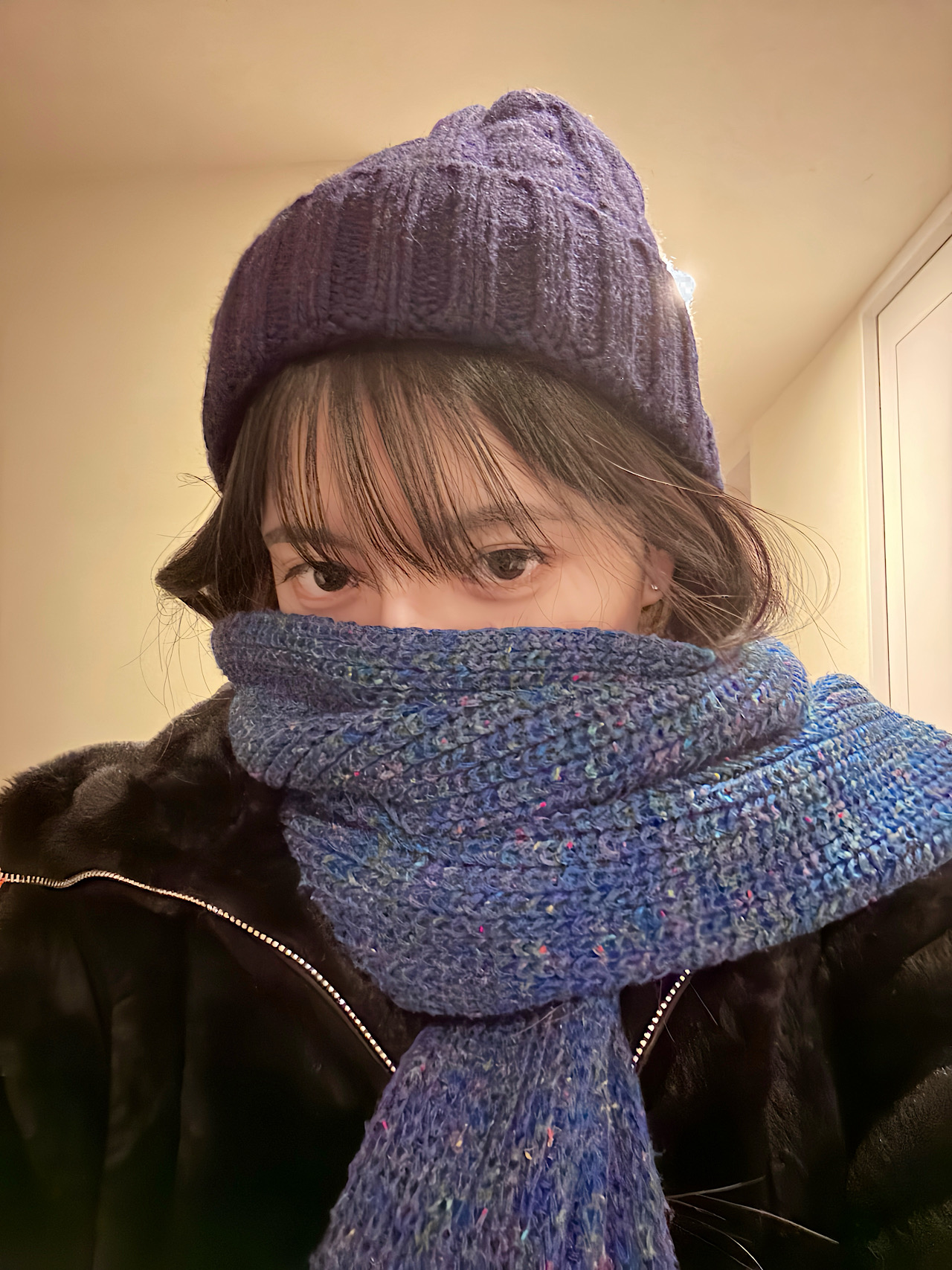 ブルーの中にさまざまな色が混ざっていてとても可愛く、なんと11年経った今も現役。巻くとボリュームが出るので、雪の日にもおすすめです。