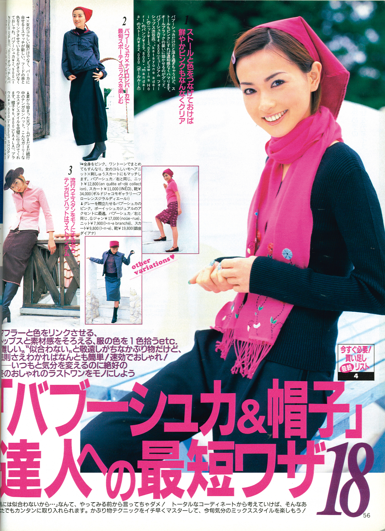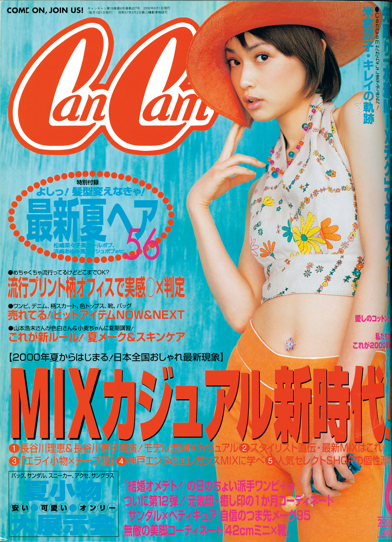 ガングロや浜崎あゆみさんブームもあり、ギャルの影響力が強かったこの頃、CanCamもカラー特集が多数! 原宿カルチャーも浸透し、古着MIXなど派手めなアイテムで個性を出す時代に。今再ブレイク中のバブーシュカなど、ヘッド小物で盛るのもトレンドでした。