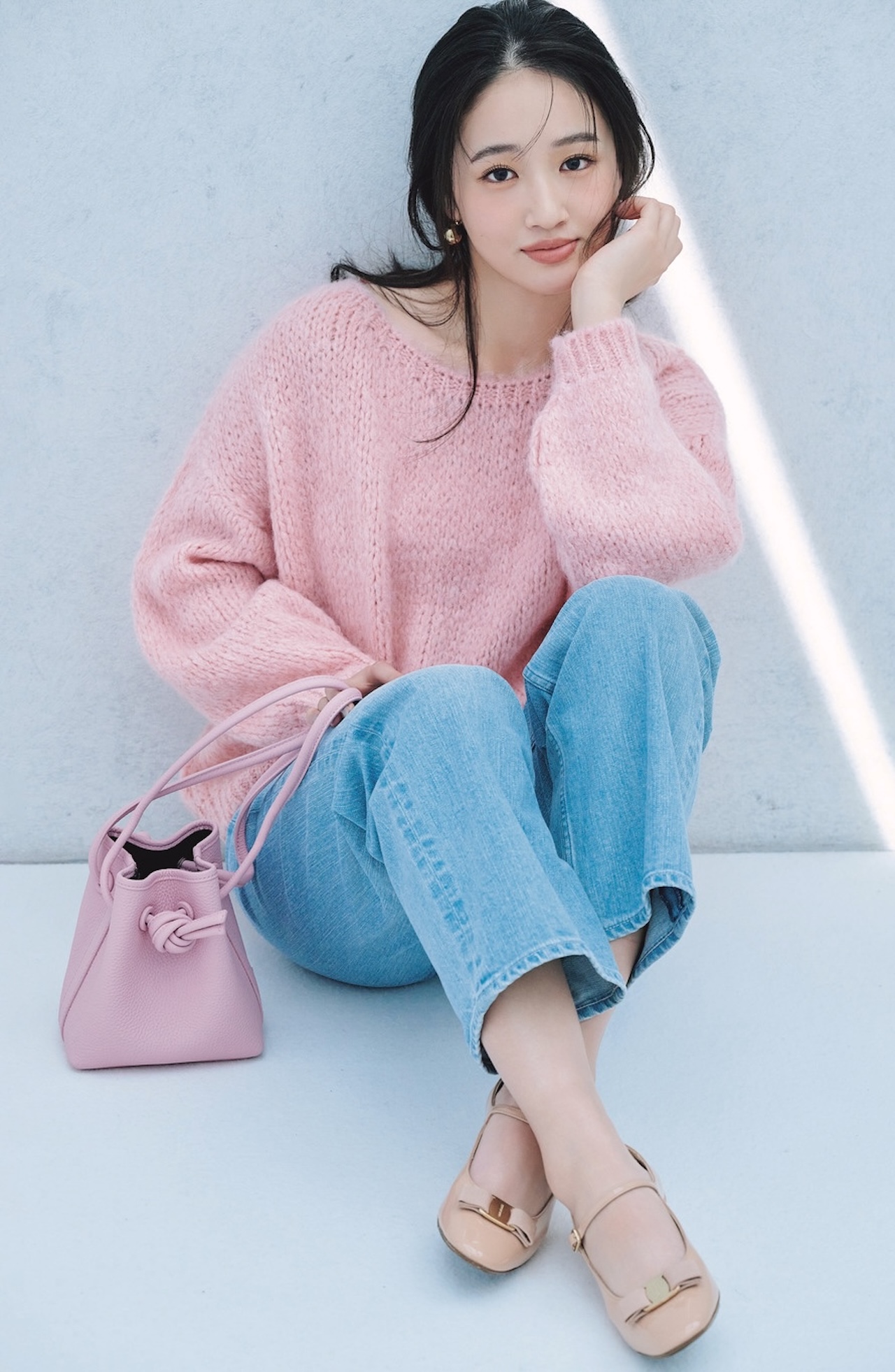 ロイヤルな甘さが漂う〝ヴァラ〟シューズと優しいピンクで、お育ちよさげなカジュアルスタイルが実現♡ 足入れがよく、履いていて疲れないのもうれしいポイント! 靴[ヴァラ/3]¥121,000(フェラガモ・ジャパン<フェラガモ>)、ニット¥16,280(セムインターナショナル<TRICOTS JEAN MARC>)、パンツ¥30,800(カイタックインターナショナル<ヤヌーク>)、バッグ¥44,000(ヴァジックジャパン<VASIC>)、ピアス¥4,950(mimi33/サンポークリエイト)