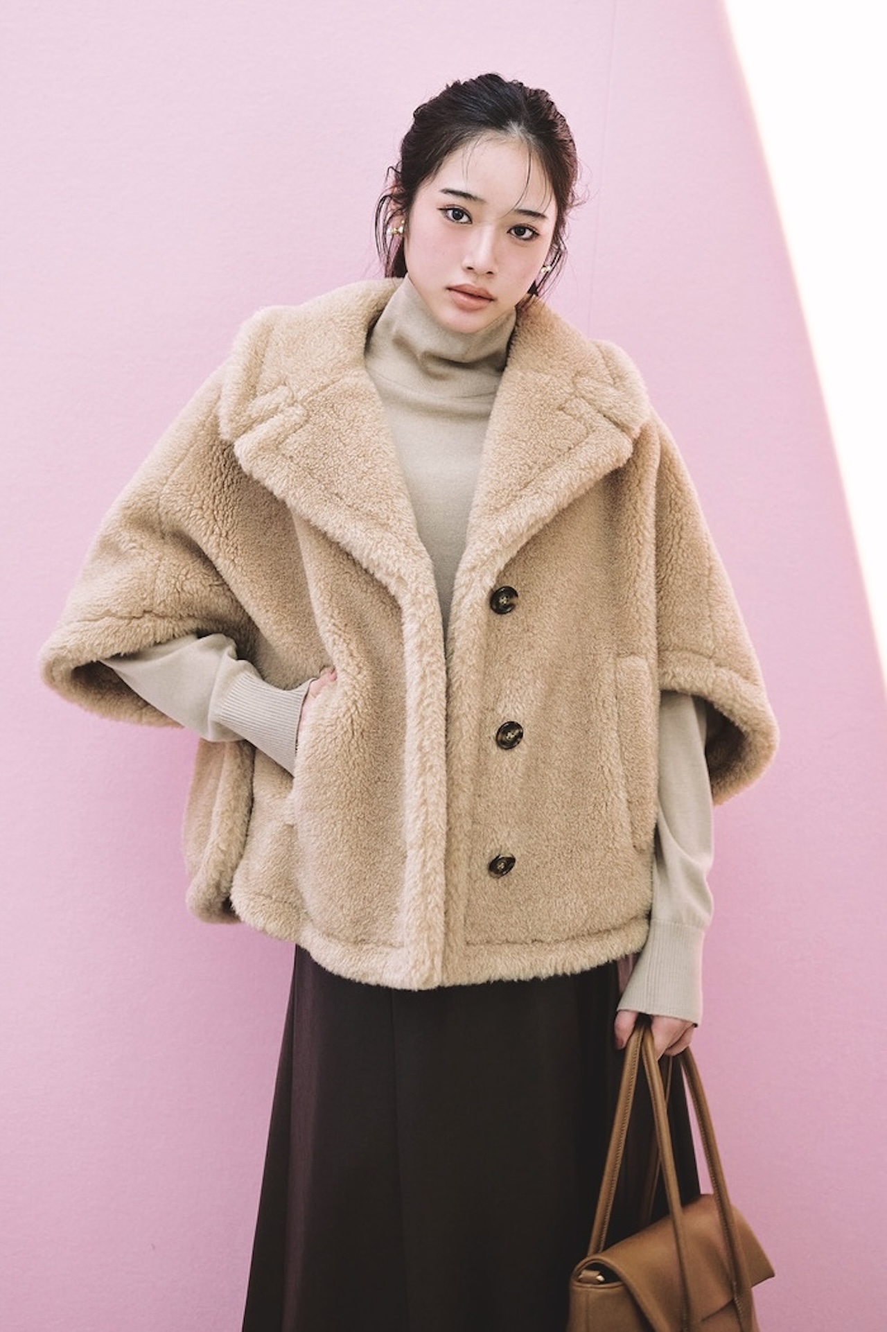 抜けよくスッキリと着られる、〝テディベア ケープ〟の新作。ベージュ〜ブラウンの優しいグラデーションでまとめて、大人の余裕漂う上品カジュアルに。コート¥422,400(マックスマーラ ジャパン<マックスマーラ>)、ニット¥16,000(バナナ・リパブリック)、スカート¥16,500(MERCURYDUO ルミネエスト新宿店<MERCURYDUO>)、バッグ¥5,278(ワールド<grove>)、ピアス¥2,640(アネモネ/サンポークリエイト)